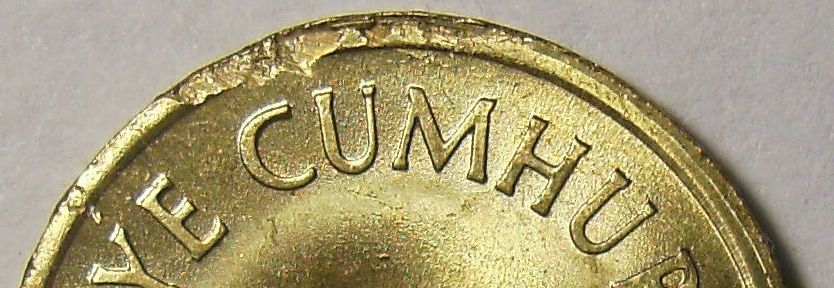 Is this a defective planchet? From the front is doesn't look like it, and it doesn't look like this coin had much opportunity to get damaged like this. This is the edge. The first picture lines up with the mark above CU in Cumhuriyeti. The second picture lines up with YE in Turkiye. Oh, by the way, if you know where this came from, can you tell me?