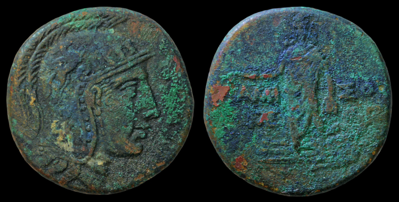 Medusa Moneyer issues of Imperatorial Rome, L. Plautius Plancus 47 BCE AR Denarius, 3.79 gm Obv: L. PLAVTIVS; facing mask of Medusa, serpents at either side of face; banker's mark on cheek Rev: PLANCVS; Aurora (or Victory?) flying right and conducting the four horses of the sun. Banker's mark in left field. Ref: Plautia 15b Sear 429, Cr453/1b; Syd 959a. formerly slabbed by NGC PONTOS, Amisos 85-65 BCE, time of Mithradates VI Eupator AE29, 19.5 gm Obv: helmeted head of Athena right; gryphon on helmet Rev: AMI-ΣOY; Perseus standing facing, holding harpa & Medusa's head; Medusa's body at his feet, blood gushing from neck; monograms in both fields Ref: SNG BM Black Sea 1166; Stancomb 684; SNG Copenhagen 137 (best guess) purchased from a local jewelry store May 2014; pre-cleaning picture is here.