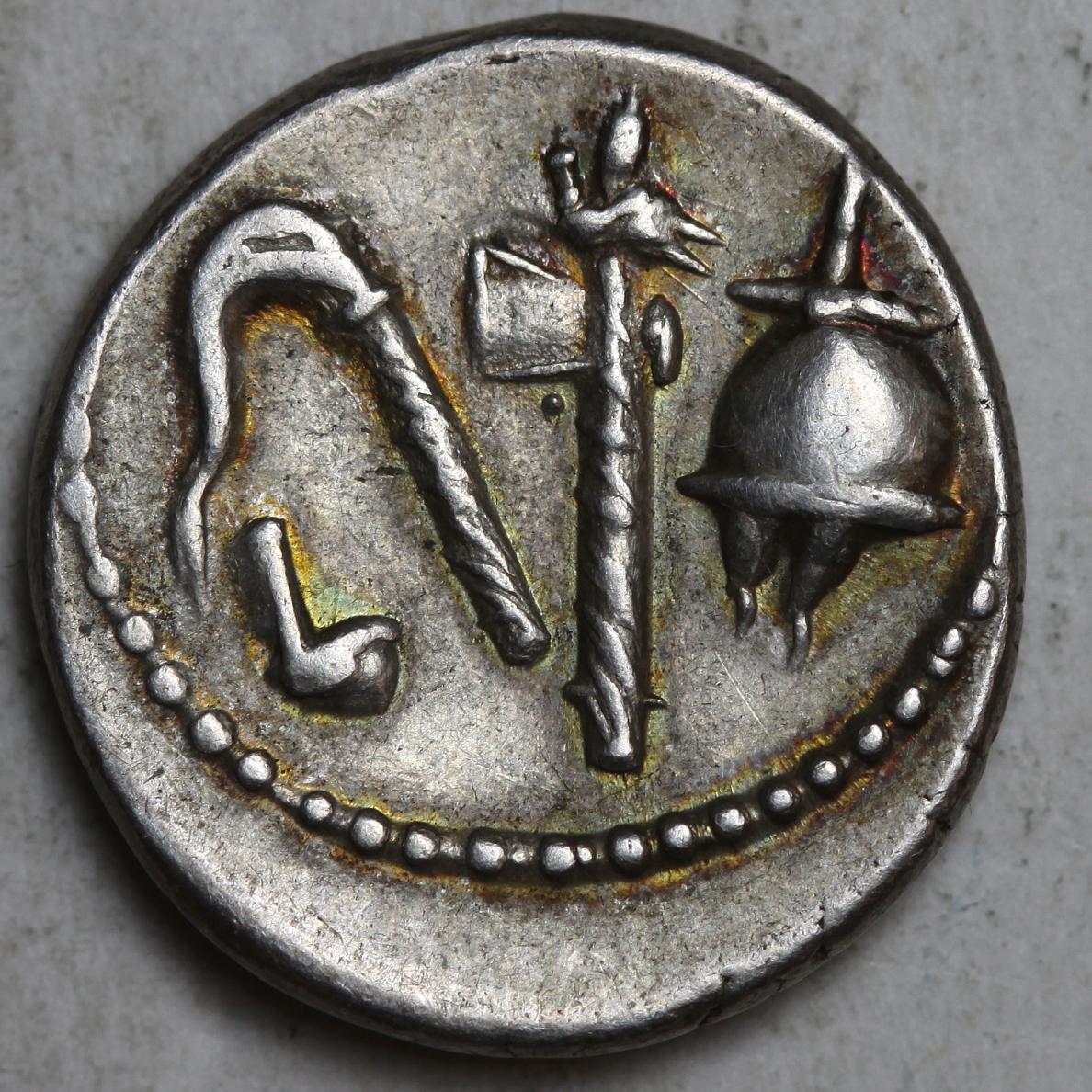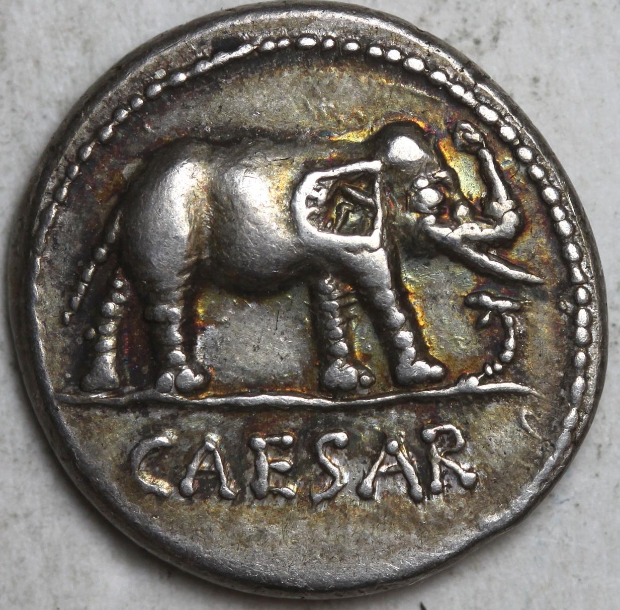 Looks fine to me. Attractively toned, too. April-August 49 BC. Military mint traveling with Caesar. Crawford 443/1; CRI 9; Sydenham 1006; RSC 49.