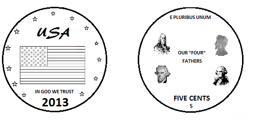 Here's mine. The front has the flag on it, along with the date, stars, and "In God We Trust". The reverse has 5 cents, with the mint mark below it (Takes after the buffalo nickel). The reverse also features Washington, Lincoln, Franklin, and Jefferson with the words "Our FOUR Fathers". I do realize I spelled Fore the wrong way, but it makes the coin humorous. This was a lot of fun; good luck everyone! I made this in paint
