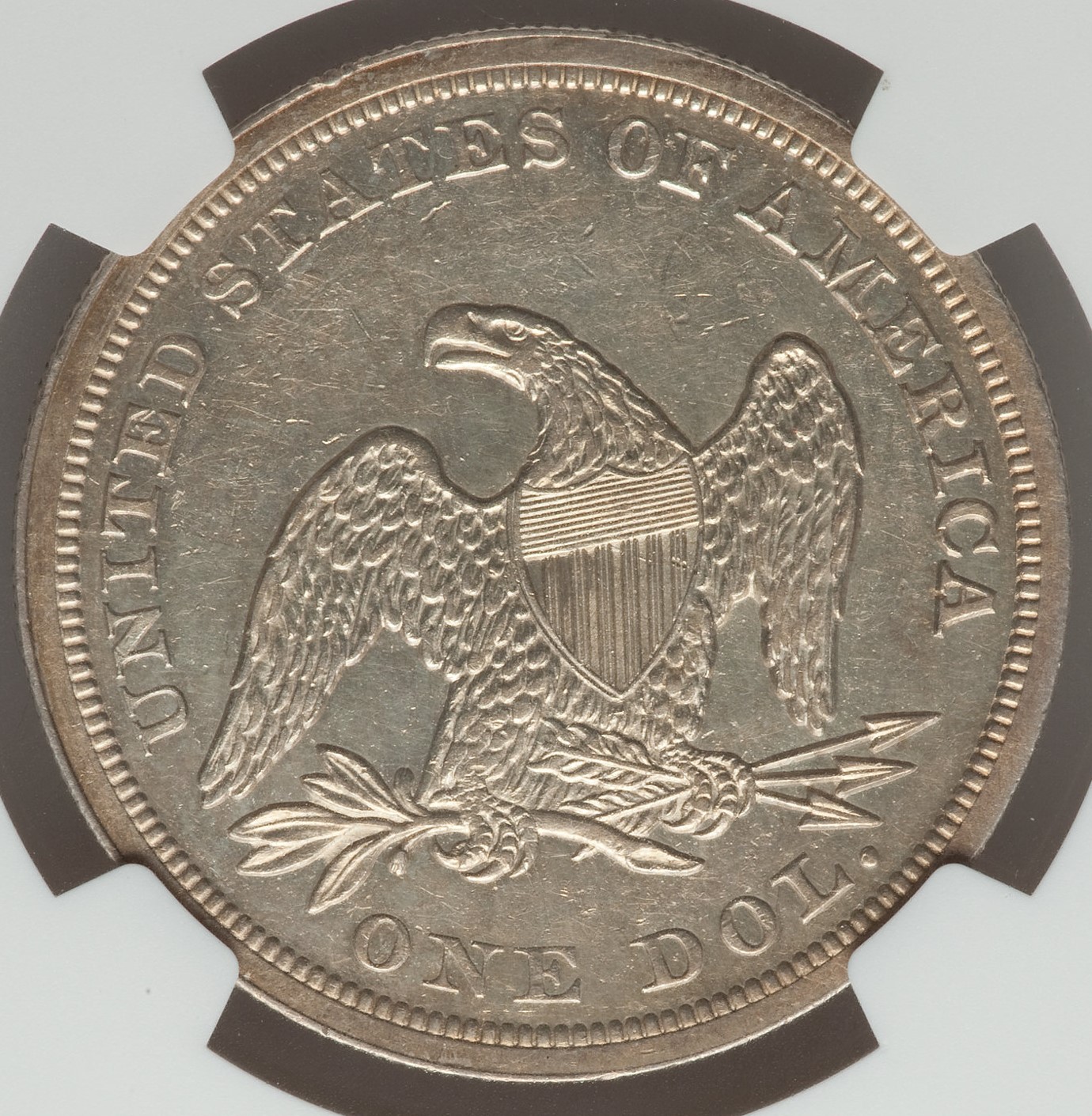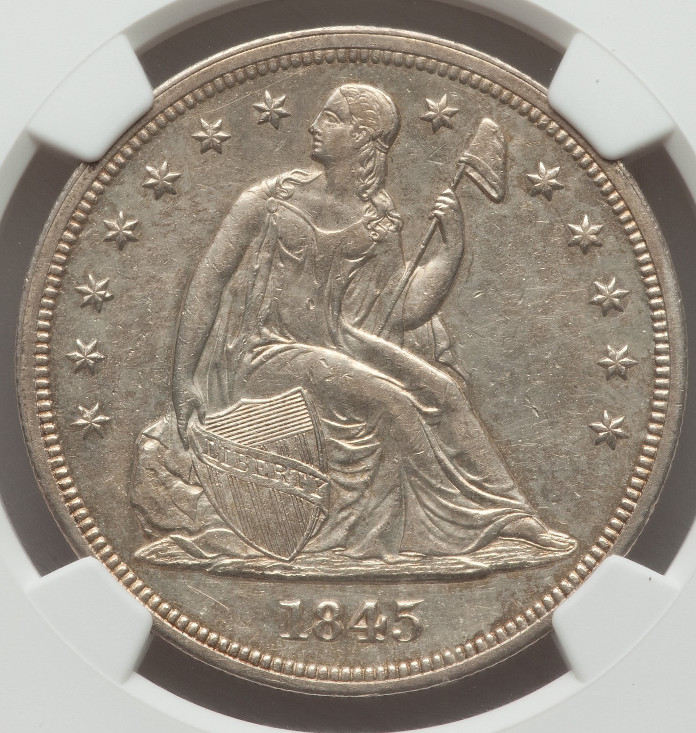 Here is a picture of my 1845 seated dollar graded AU 55 by NGC. Technically, this coin has been dipped sometime in the past. Dipping a coin is a type of cleaning but, because this was commonly done in the past and still is done today in most cases it gets a pass. Take a good look at my dollar. I'm 95% sure it was dipped at least once in the past. However, it is still a really nice coin. Technically it's a "Details" coin but not graded as such. The most ridicules term I see on a slab is SALTWATER AFFECT. Come on folks that coin sat on the bottom of the ocean for over 150 years and had to undergo a serious cleaning to get the crust off it. These coins are all pitted from saltwater corrosion. They are all white and the corrosion has eaten away at the coins details. If those coins weren't in a slab with a ship name on it plus being graded as "Saltwater Affect" no one would buy them. They put them in a fancy box with a story and amazingly now they can sell them for hundreds of dollars.