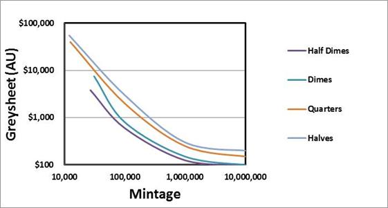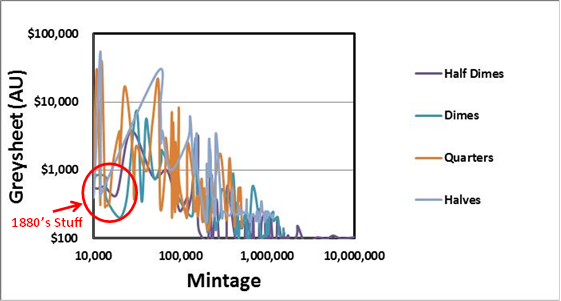 Everybody seems to agree that demand is the primary driving force behind value of older coins. I wanted to graphically represent the influence of collector preference, and I figured that the Seated Liberty series would be the most accurate way of doing that (Essentially the same coin design in different denominations). Here's a plot of the raw data for value vs mintage for the different denominations: It kinda looks like the value trends for each denomination are similar when plotted like this. I fitted a least residual squares function to each data set to smooth it out. I also ignored the coins issued in the 1880's because they are comparatively cheap even though mintages were very low (I guess a lot of them were hoarded by collectors or something?). The smoothed data plots look like this: I guess that it would make sense that people prefer the larger versions of particular coin designs. As this will probably always be the case, this type of comparison also does not necessarily indicate over- or under-valued coins. However, I have heard many experienced coin collectors say, "When a particular series increases in popularity, the key dates are the first ones to move and the rest follow". The quarters and halves are kinda bunched together and dimes and half dimes are bunched together. But you do see a trend where the "key date" end of the dime plot is creeping up towards the quarters and halves. Do you think that this may be an indication that the rest of the dime series will follow?