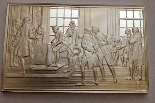 This bar is part of a set made by the Franklin Mint (The first hallmark) for the Bicentennial (second hallmark telling when made). Each bar has a scene from the colonial/revolutionary era. My guess is this one represents the signing of the Declaration of Independence (That may be marked on the back). It is Sterling silver (the Sterling mark and the third hallmark) as mentioned .925 fine instead of .999 fine. The bar weight seems to be off slightly it should have been 1.89 oz. That would give it an even 1 3/4 t oz of silver. I think there were either six or eight bars in the series and they were housed in a nice wooden display chest. Personally I have always liked the Franklin Mint art bar series. They are well done and usually with good artwork. The FM sold them at a huge mark up over silver value. They probably cost at least $20 each. They sold them as art, history, and as heirlooms. Dealers hated them. They were the 1970's equivalent of the TV coin shows of today selling "overpriced junk" to people who would never be able to get their money back out of it. Even though they are very nice they have never sold for much over their metal value although sometimes you can get a small premium for full sets if you can find a collector.