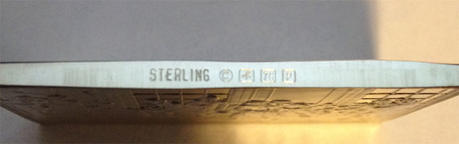 I'm a complete noobie and I've just started collecting silver coins and my local dealer turned me on to these silver bars that on one side show a picture of historical US events. He said they are 1.85oz silver bars and even showed me the weight of 1.86 troy oz. At any rate I get home and notice on the top of the bar in very small print is the word "Sterling" which makes me think this isn't pure silver even though he sold it at the same rate as his 1oz American Silver Eagles ($37.50 per ASE) and I paid $69 for the bar. Is this thing silver or no? Thanks! EDIT: looks like the forum resized the pictures to tiny size... next to the word Sterling looks to be a copyright symbol, then the next box I can't really make out maybe a Y or 4, then next to it a a box with the number 76 in it and the last box is the letter P.