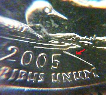 A fellow member asked me to post some photos of some of my die gouge coins , so here they are. My photography skills is not very good, I hope you can see the photos.the first two photos are of California quarters it looks like John Murel has a dagger in his hand in the first photo and in the second photo it looks like he has thrown the dagger at the condor bird . this is almost comical how these die gouges can appear this way. the 2005 nickle is a P mint coin. the fourth photo shows a fairely large die gouge that makes it look like a torpedo is going thru the water towards the loon bird.this is the only one of these I found from a full box of new quarters. the last photo shows what looks like a extra wave above the loon bird's tail.this one may be a die crack.