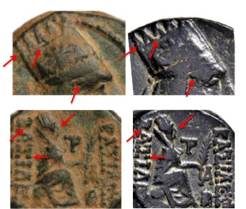 Dear All, I have recently pulled the trigger and acquired a Tigranes II (The Great) bronze coin. Have always looked for a good quality, but an affordable coin from the Armenian Kingdom (and short-term Armenian Empire during the reign of Tigranes II). The look of the coin is below (using the original photo from CGB France, where I bought it from). Specimen A. Tigranes II (The Great) copper coin, 89-69 BC, Tigranocerta mint (based on the filedmarks), 20mm, 12h, 5.96g. Obverse: head of Tigranes II right, wearing Armenian flapped five-pointed tiara, decorated with 8-pointed star between two eagles. Reverse: BAΣIΛEΩΣ BAΣIΛEΩN TIΓPANOY, Tyche seated right, holding palm, below, river-god swimming right, letter A above the river god, and TP monogram above the hand of Tyche. Dark green (almost black) patina. The coin (let's call it specimen A) arrived yesterday. It felt much better than the picture above, and I was very inspired to write about the coin and the history it represents. However, there is more to this coin that I need to find out with your help before turning to the former pleasures. Very quickly I realized that the coin is definitely obverse die linked to another coin that CGB has in offer. That second coin is brought below. Specimen B. Analogous coin, obverse die linked to the coin A. This coin has the following metrics: 18.5mm, 12h, 6.69g. The match of the obverses is especially clear when you look at the arrangement of the dots and the 5 spikes of the tiara. A figure to outline the similarities is below. To become absolutely sure in this, I also took the outline of my coin and transferred to the image of the second one. All the dots of the circle completely match each other, with all their intricacy of the arrangement. I called CGB, and they told me that both coins (A and B) did not belong to the same person. So the things became interesting, and I started to look for all the coins that acsearch returns for Tigranes II. A few hours later I found a coin (Specimen C) that seems to be a complete die duplicate to Specimen B. Specimen C. Complete die duplicate of Specimen B. The only metric brought for this Gerhard Hirsch Nachfolger coin is for its size: 19mm. The figure below outlines the anchoring point to recognize the similarities between B and C, reverse and obverse. Please, also note the relative intricate angles between the vertical texts BAΣIΛEΩΣ and BAΣIΛEΩN. Now, I am still researching the ~1700 coins in the database (interestingly, found numerous die duplicates between other Tigranes types too), but being a beginner in this area, this leaves me a bit puzzled... Is it actually this easy to find die linked coins or die duplicates? A beginner buys a coin A and within a day finds an obverse die linked coin B and a coin C that is a complete die duplicate of coin B. Isn't this a cause of concern? Should I return the coin? Will much appreciate your expertise/insight and advice on this. I will myself add more data as I go through the other coin images. Thank you so much for your help, Alex