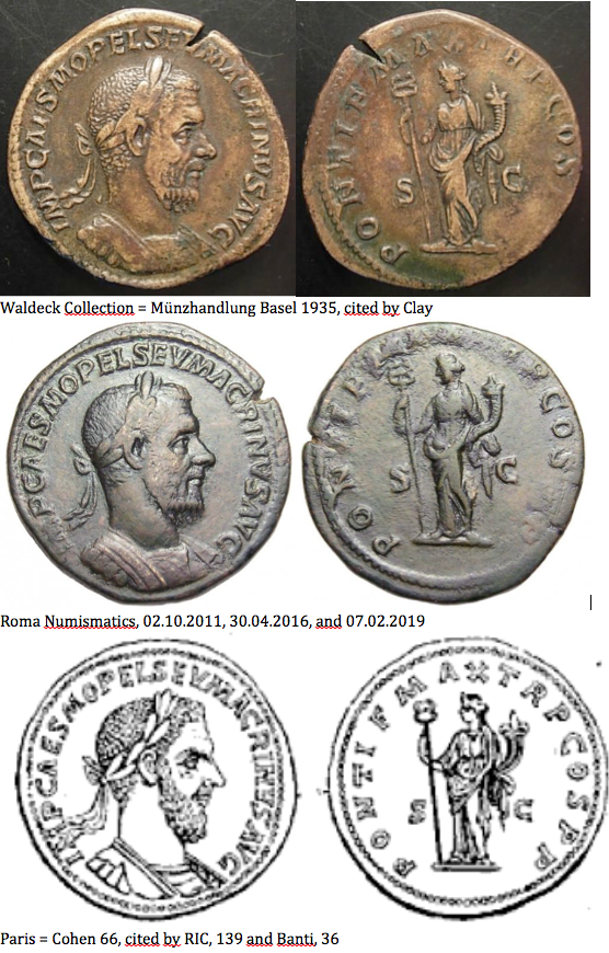 This shows that Sestertius production during this time was so limited that one obverse die (the only one originally showing Macrinus with a medium beard) was not only used over several emissions (RIC 121 predates RIC 139 as the COS II is missing), but also for several reverse designs.