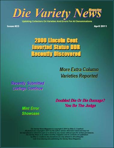 Die Variety News (DVN) magazine April 2011 issue #23 is now online and available for viewing at your leisure. In this issue we highlight a strange inverted statue doubled die reverse that was just discovered on a 2000 Lincoln cent. More "extra column" type varieties are coming in at a fever-pitch rate to be on the look out for. Our "Recently Submitted Listings" section continues to expand illustrating the many varieties that have crossed the editor's desk since publication of issue #22. We have updated photos on a previous listing 1994 1c CDDR-003 and we take a close look at a 1983-D Lincoln cent; is it a doubled die or some form of die damage? You be the judge. Plus our "Mint Error Showcase" highlights some nice errors submitted from DVN readers found in circulation to share with you plus a lot more with 115 pages of varieties and errors! I hope you enjoy this DVN #23 and find it informative and helpful in your collecting and searching endeavors. All the Best, Billy (dvn)