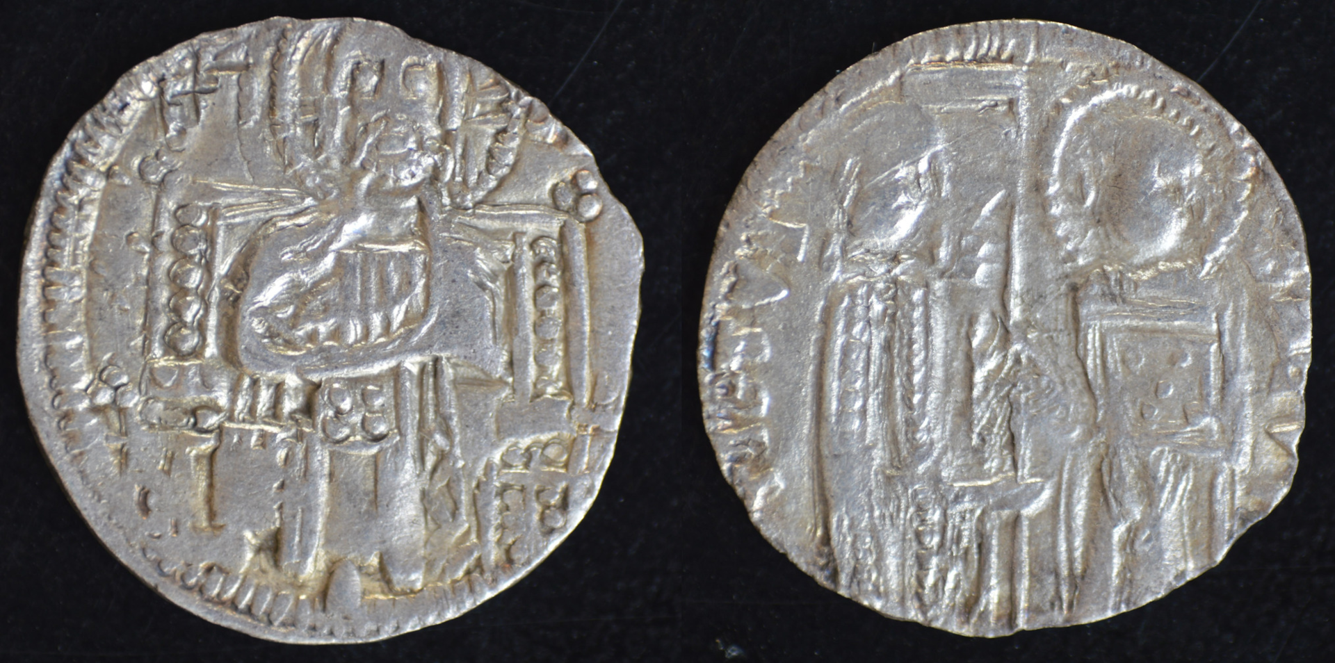 My only example: It is my only example of the Venetian grosso trade coinage. This coin was minted in Venice between 1275 and 1280. Like all of them, the reverse depicts Jesus Christ on a throne. The obverse depicts Doge (Jacopo Contarini) together with the Venetian city’s Saint Mark. The Doge is on the left receiving a tall flag from St. Mark on the right. I would enjoy learning more about your example.