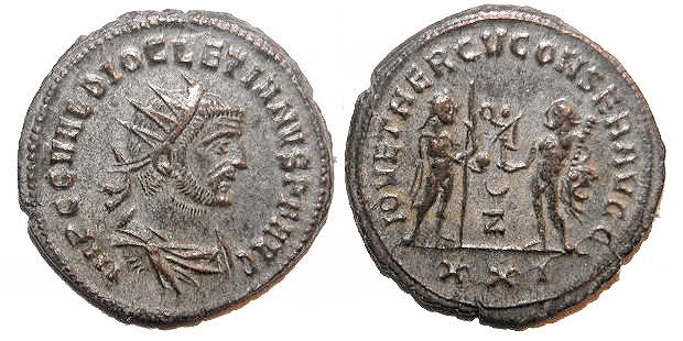 Nice example. I have seen a few of these lately but never been able to score one at a good price. Diocletian (284 - 305 A.D.) Æ(S) Antoninianus O: IMP C C VAL DIOCLETIANVS P F AVG, Radiate, draped and cuirassed bust right. R: IOV ET HERCV CONSER AVGG, Jupiter stg R hldg globe and scepter; Hercules stg L hldg Victory, club,& lionskin, crescent & Z in center, XXI in ex. Antioch Mint 4.0g 21.6mm RIC V 323