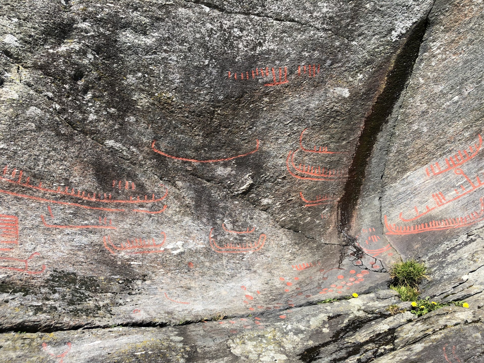 Actually, they have stopped painting them. They found out that the pain protected the original carving from wear, while the fields around would wear, evening out the carvings. There are quite a few sites with carvings from the bronze age, monoliths from iron age and even early christian stone crosses around that area. The fjord nearby was where the final battle to gather Norway into one realm stood, in 872 AD. They have raised this modern monument for that: