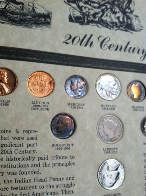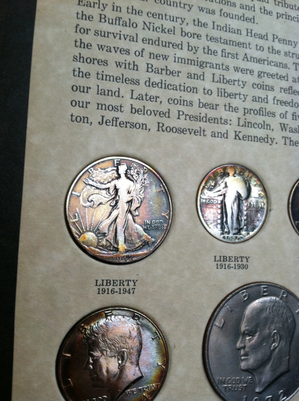 Folks, these coins are polished. That is why they have taken on these colors. This is quite common for these framed sets.
