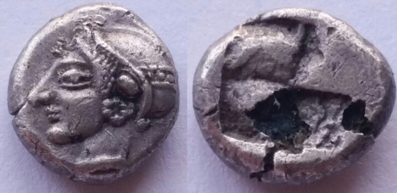 My smallest Greeks, combined with a 15 mm Pontica drachm for comparison. From left to right: a Kyzikos hemiobol (9 mm, 0.38 gr.), a Colophon tetartemorion (7 mm, 0.24 gr.) and an Erythrai 1/96 stater (4 mm, 0.12 gr.).