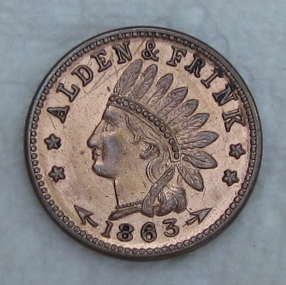 Lastly, we have an R-1 common copper Alden & Frink storecard which includes the Indian cent design. (obv) Alden & Frink 1863 (rev) Merchants 40 Mohawk St Cohoes NY Fuld-NY-140A