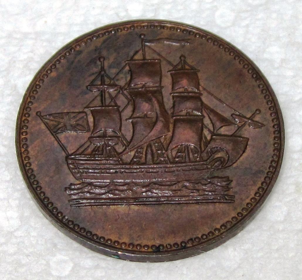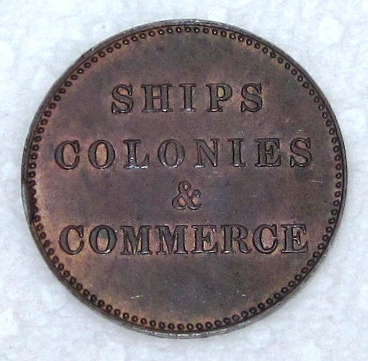 This second token is not a Civil War Storecard. It is a token from Canada. The obverse reads “Ships, Colonies, & Commerce”. I looked it up in the Charlton Token book. Apparently, this one has the common “&” but it is in really nice condition. I grade it AU. This dealer has dozens of high grade Canada tokens but I am far from being an expert on them. If any of you guys are interested, then I can introduce you to the dealer (and all his Canada tokens) via PM.