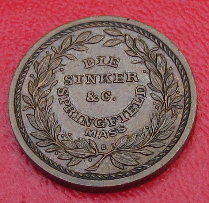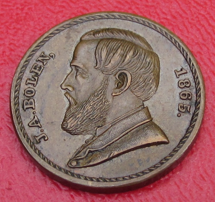J. A. Bolen, 1865 This third token commemorates the man that made the dies for many of the old tokens and storecards. This piece has the appearance of (copper) although the Rulau catalog specifies (oroide) for this 1865 dated piece. Only 50 struck. The die sinker is J. A. Bolen and here is his storecard: (obv) J. A. Bolen, 1865. (rev) Die Sinker & C. Springfield Mass B Rulau Ma-Sp 34 Miller Mass #109