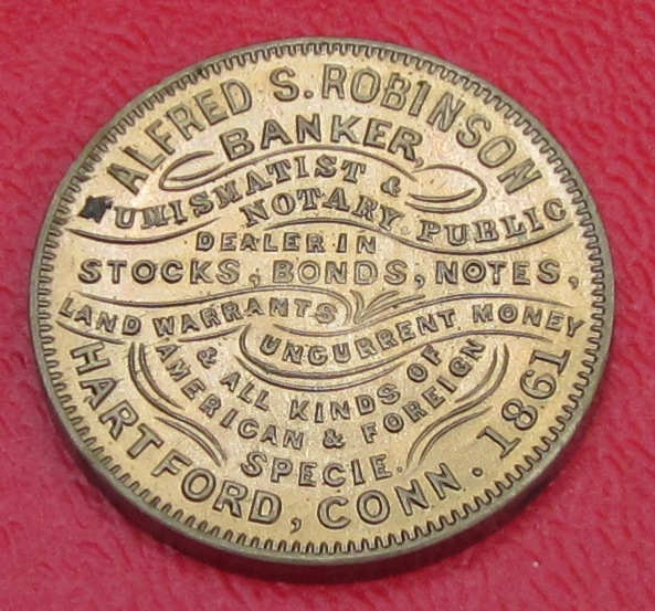 I broke down & paid the dealer’s price for this Connecticut storecard and bought a couple more good tokens in the lot. This first storecard is the Higley - Granby token which I posted last week. It is mine now. I’m thinking it is white metal or plated & not necessarily the silver version. 20 examples were produced in silver and 150 examples were each produced in brass, copper, nickel, plated and tin. I suppose that a specific gravity test may be in order for this one to determine its composition. This is a numismatist’s storecard. (obv) Valve Me As You Please (rev) Alfred S Robinson Banker Numismatist & Notary Public Dealer in Stocks, Bonds, Notes Land Warrants, Uncurrent Money & all kinds of American & Foreign Specie Hartford Conn. 1861 Rulau CtHa 15 Miller Conn 10.