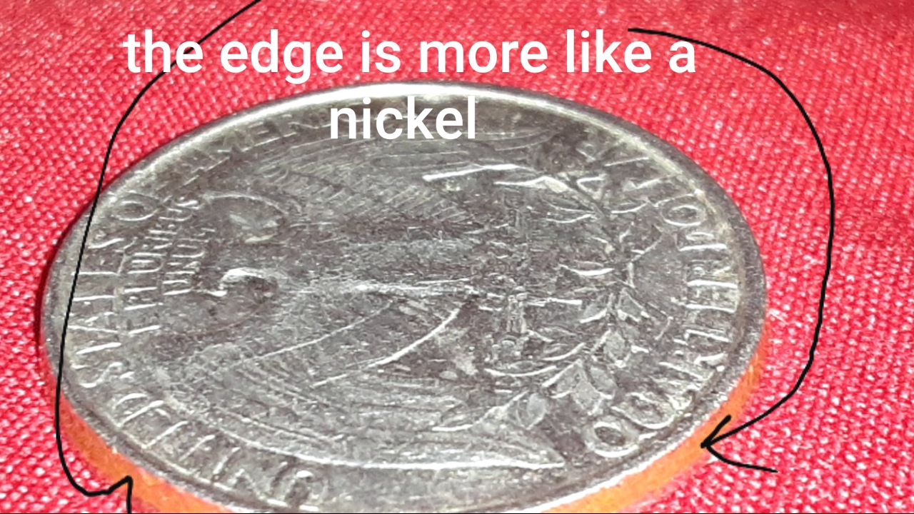 Can you give us the weight of the coin? It's a clad quarter. The weight should be 5.67 grams +/- 0.227g. Clad quarters are composed of outer layers of copper-nickel (7.50 copper, .250 nickel) bonded to inner core of pure copper. (As per Redbook). It appears that someone filed (or spooned, sanded, etc.) the edge, removing the reeded edge ,and exposing the inner core of pure copper. I'm not an expert on this so wait for more opinions.