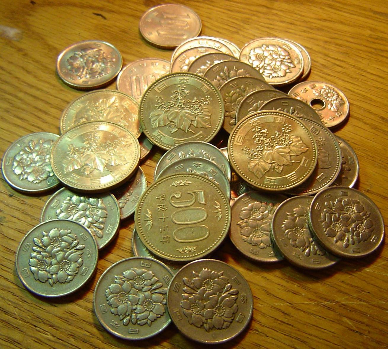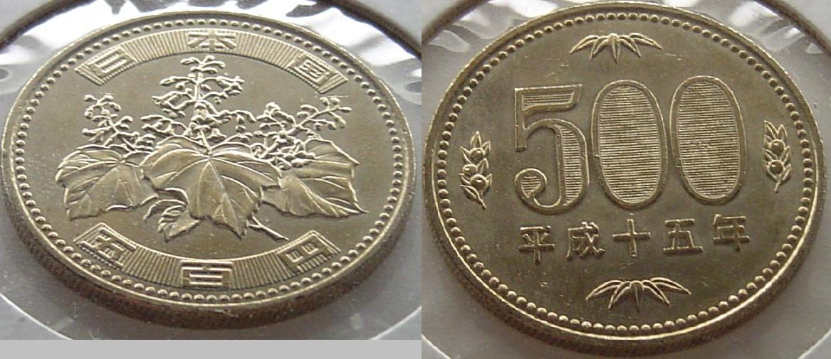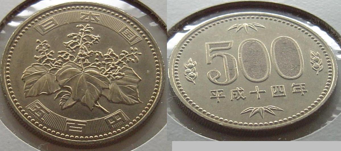 Yen Interesting stuff. Look how pretty these two different modern 500 Yen coins are, I am saving 4 of this type of 500 yen coin for my collection, as well as some nice 50 and 100 yen coins, and exchanging the rest.... the modern 50 and 100 yen coins are also quite beautiful, not enough room for pics to show the design of them all though..... I also include a pic of a 1958 50 yen further down(4th photo from the top), it was a gift from a friend, very pretty... and here (the third photo, obviously ) is a pile of around 6000 yen in coins. All in 500, 100 and a couple 50 yen coins in there.....might be more than 6000 yen total. The dates on these coins shown in the pile go back to the beginning of the design style of the 100 yen shown. and the last pic is of my favorite Japanese coin in my collectio currently, it is silver, so not worth it's face value, it's a 1958 100 yen. I like the bird... goes nice with the 1958 50 yen, even though the 1958 50 yen is not silver.