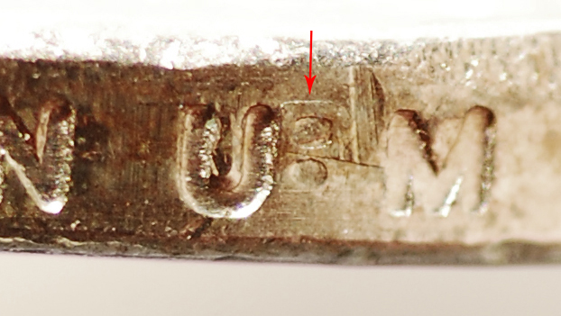 Rim of the Polk presidential dollar.The arrow points to what looks like a "B" imprint. If not a "B", should there be anything like what's showing between the U and M?...