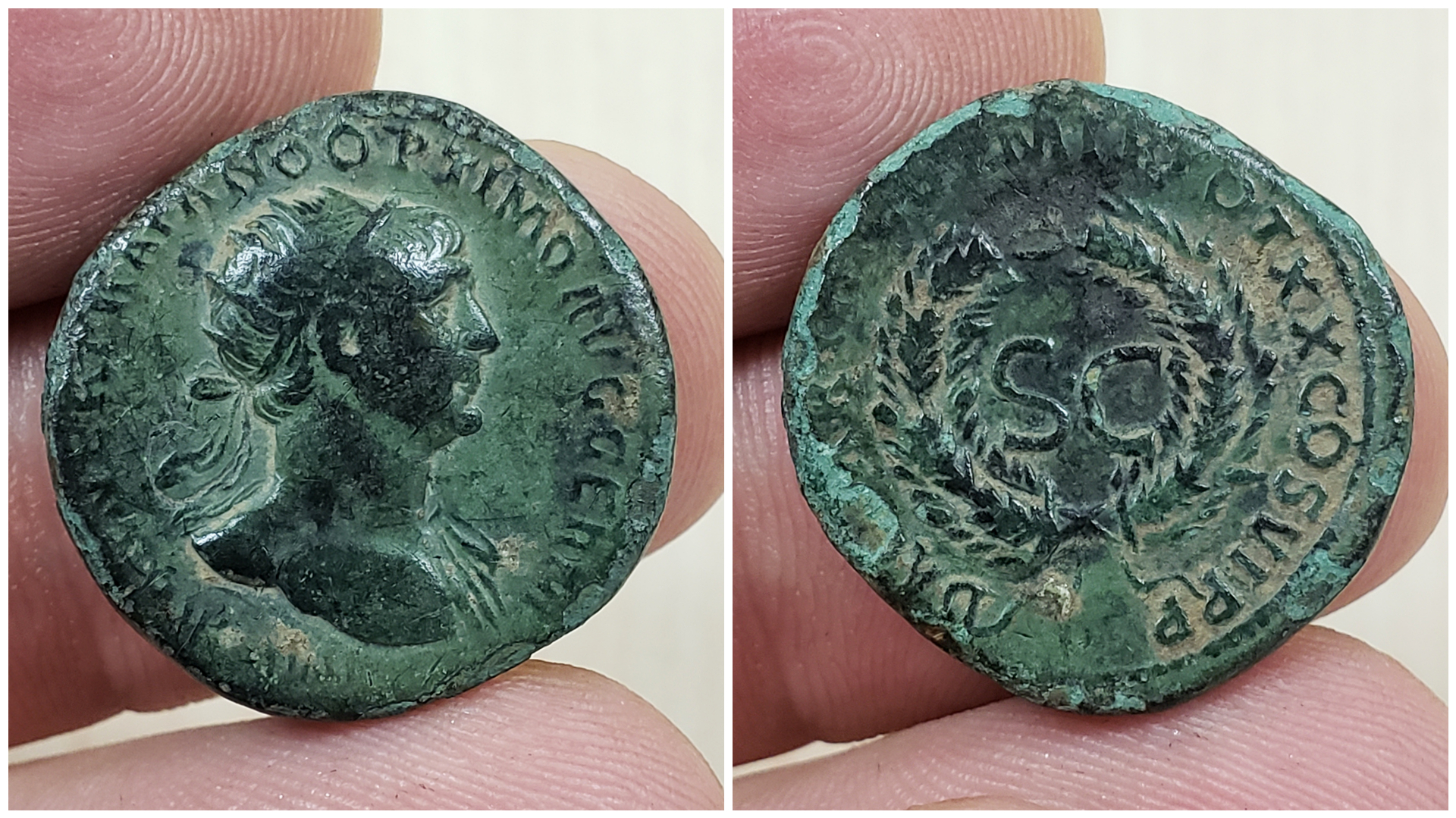 I also have one of these "brass as" coins of Trajan. Trajan. A.D. 98-117. Roman orichalcum as, 8.49 g, 23.5 mm, 6 h. Struck in Rome for circulation in Syria (?); Struck in Antioch (?), AD 115/16. Obv: IMP CAES NER TRAIANO OPTIMO AVG GERM, radiate and draped bust right; c/m: bucranium within incuse punch. Rev: DAC PARTHICO P M TR POT XX COS VI P P around laurel wreath enclosing large SC. Refs: RIC 647; BMCRE 1094; Cohen 123; RCV 3243; Woytek 937v; McAlee 509; Strack 479; BN 953-5. For c/m: Pangerl 63; Howgego 294. At one time, these were thought to be struck in Rome for use in Syria, but that may not be the case. According to the Norton Antiquities Database: "This coin is an example of a rare sub-group of Trajan's aes coinage. They are probably from an eastern mint (often thought to be Antioch, but this is perhaps unnecessarily precise). The reverse, an S C in a laurel wreath, is associated with that mint, as is the bucranium (bulls-head) countermark. The coins are dated to circa 116 when Trajan was resident in Antioch. The denomination is not really known; although radiate and of oricalcum (brass) they are smaller than dupondii. RIC / BMC label them as asses, but they are labelled as semises by Metcalf (W E Metcalf, 'A note of Trajan's aes from Antioch', American Numismatic Society Museum Notes (1977) 22, 67). They may have circulated as semises (half asses) or as half-dupondii / oricalcum asses (the as was normally struck in copper). Many examples of this type have a 'bucranium' (bulls-head) countermark like this one. There are 20 coins of this denomination at Bath, and one of them has the bucranium countermark. Outside of Syria these coins are only common in the N W provinces suggesting that they may have formed part of an official government consignment of coinage from the East (D R Walker, 'The Roman Coins' in B Cunliffe (ed.) The Temple of Sulis Minerva at Bath, Volume 2, The Finds from the Sacred Springs, Oxford 1988). The degree of wear (often worn flat, as here) suggests that they may have circulated for more than a century after their importation."