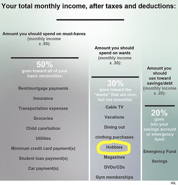 Forget that model plan. I'd say 50% goes towards bills (minus credit card payments since I keep zero balances on mine). 40% goes towards savings, emergency funds, retirement, etc and then 10% is for entertainment, hobbies, vacations, etc. I try to tuck more away, I don't want to work until I'm 90, I want to try and retire when the kids are going off to college, travel while I still can, etc. 20% don't cut it for me. ;)