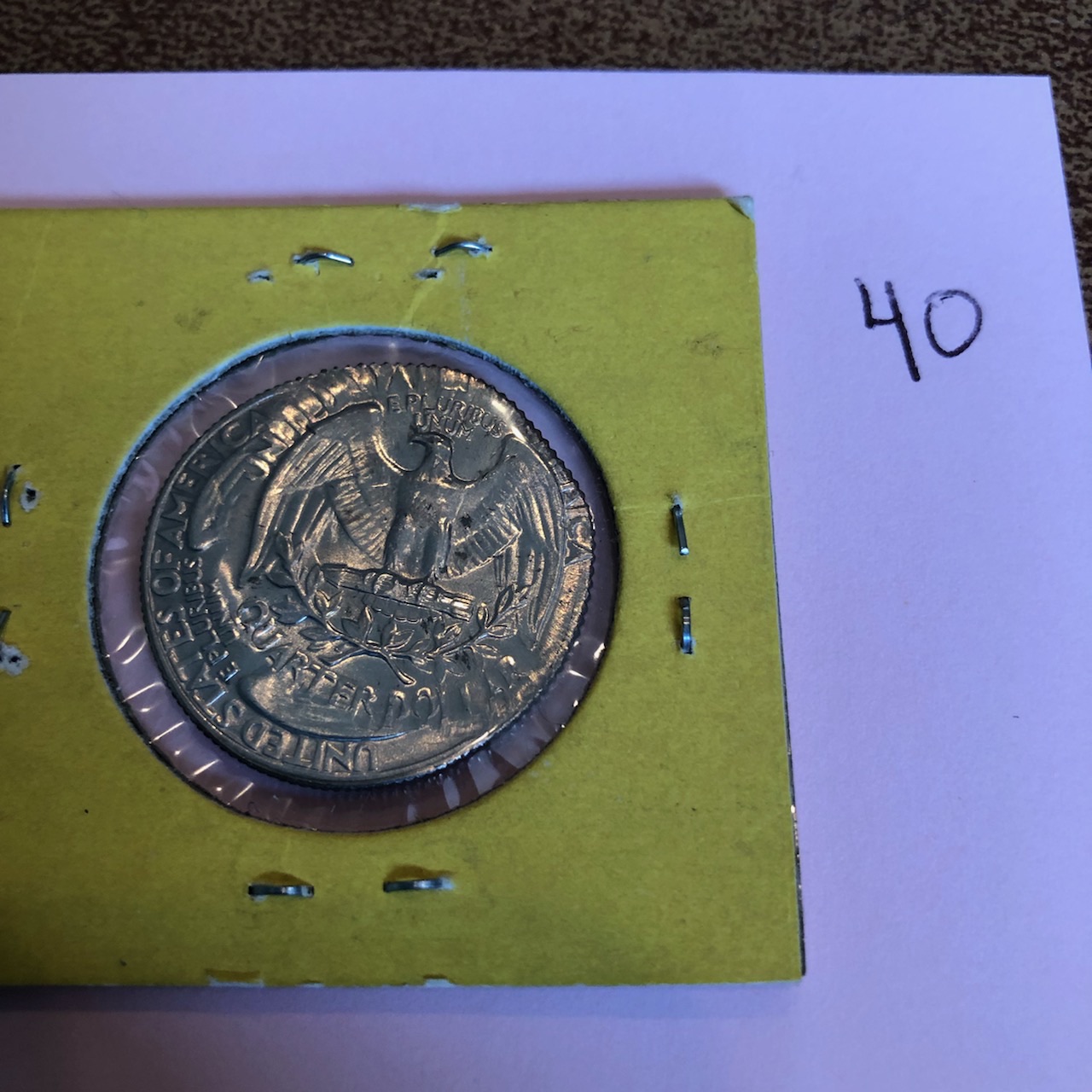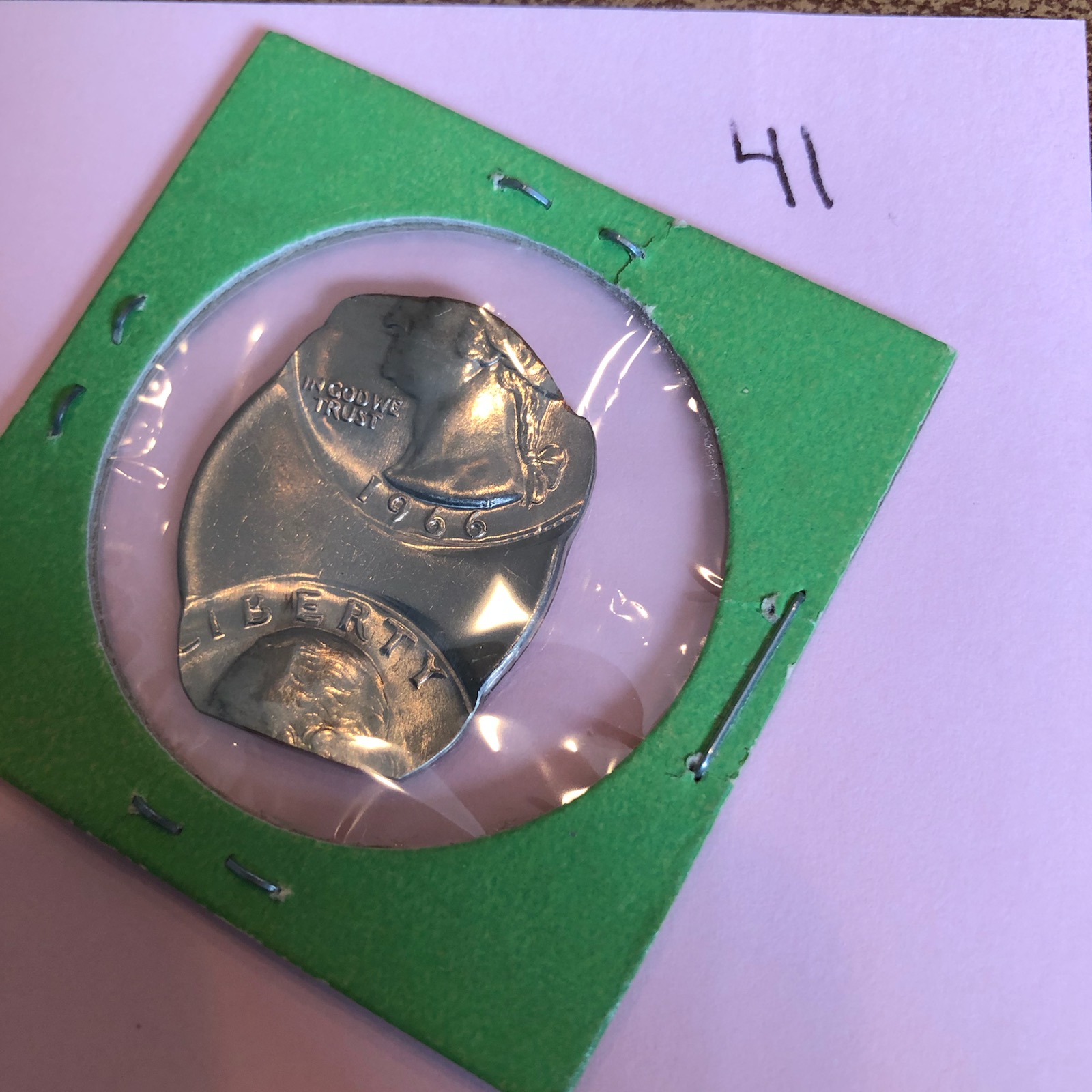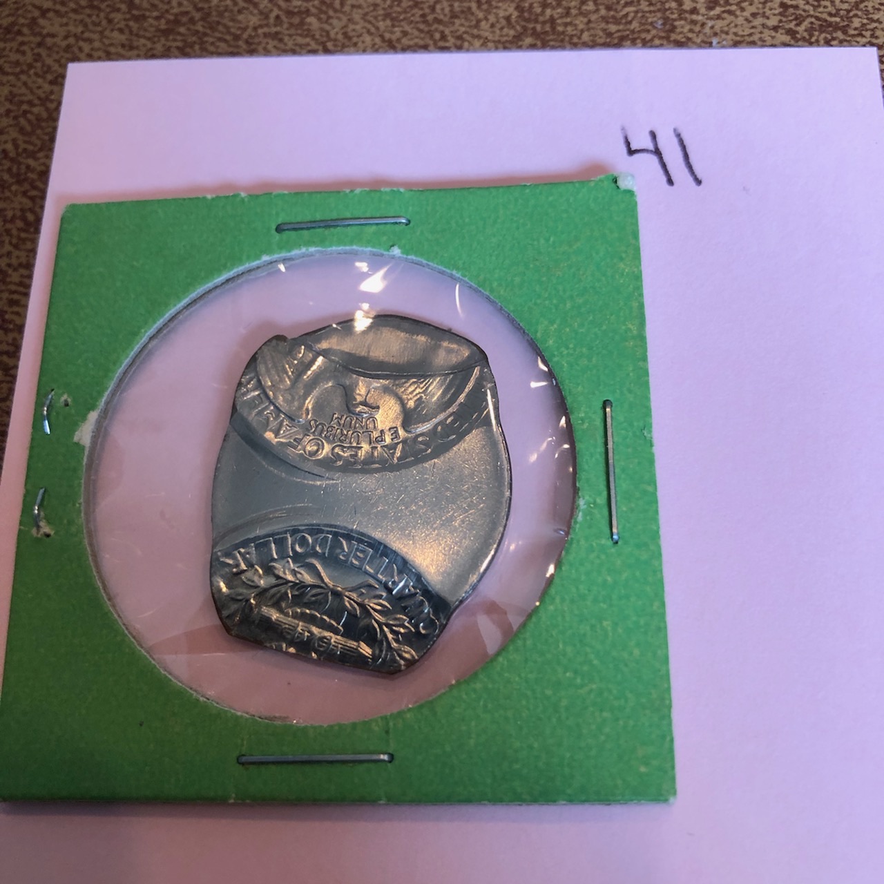 A beautiful double struck saddle Quarter and with a date. Watch those staples. This coin needs to be sent in to be professionally graded. A wonderful example of a Mint error. Minimum value $250.00, more if slabbed.