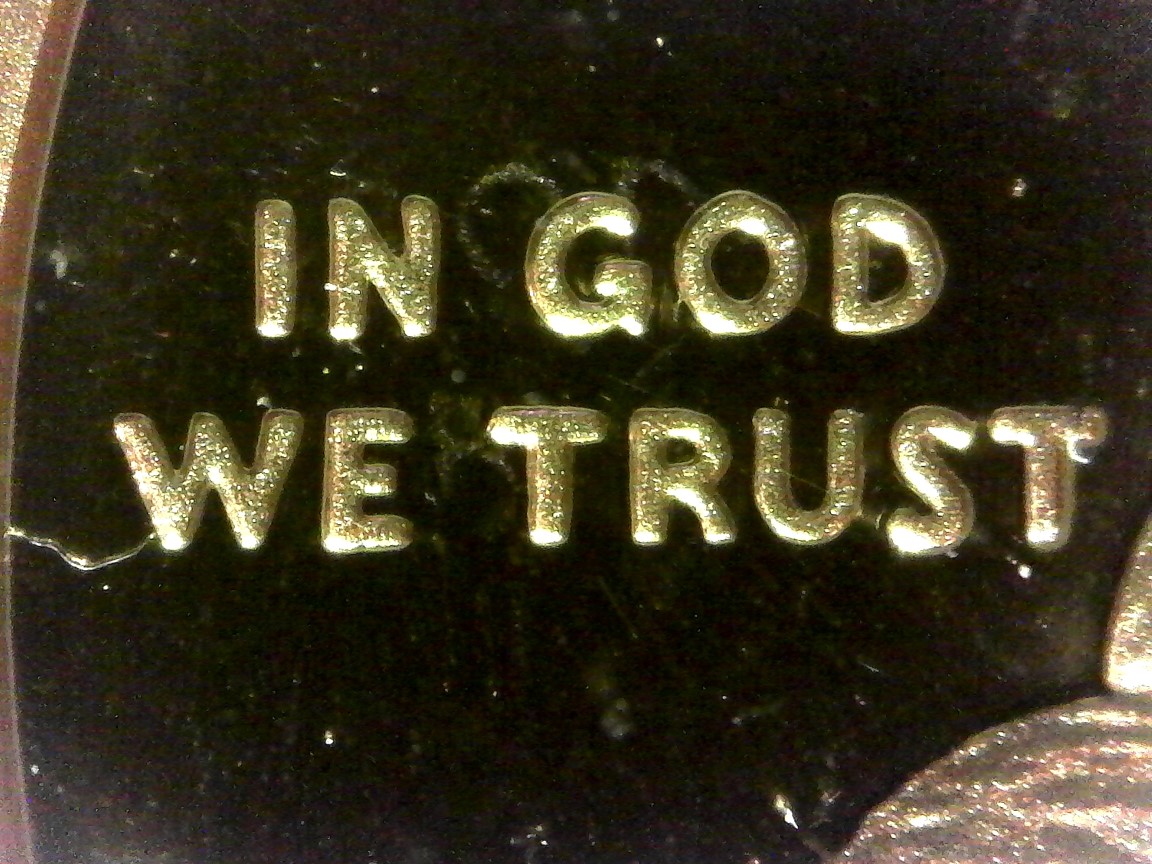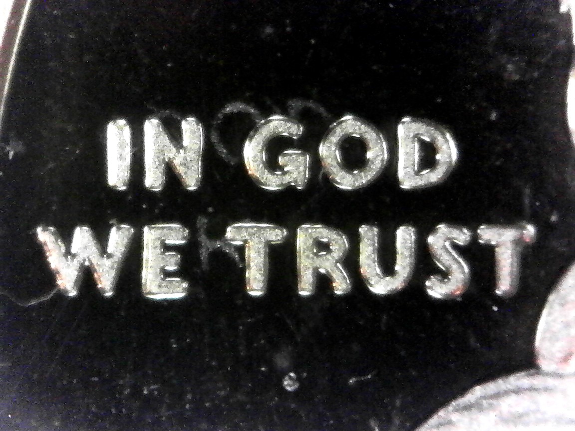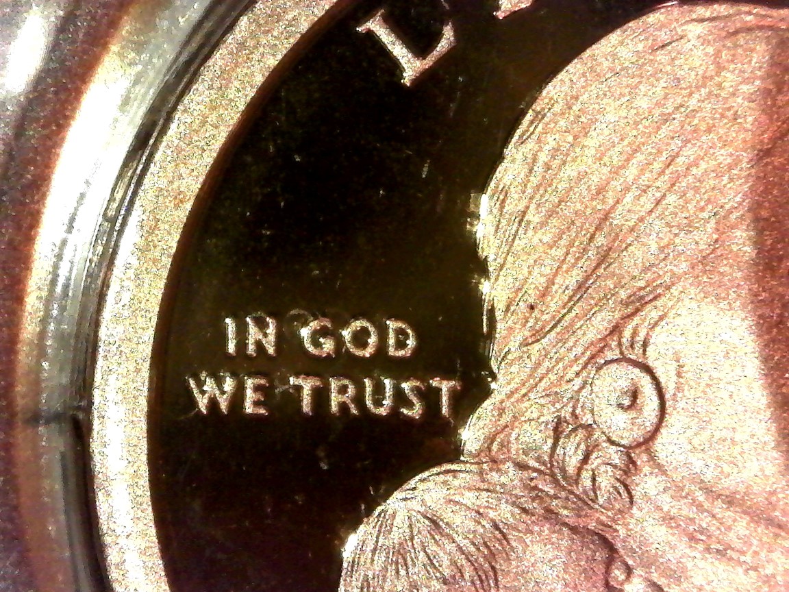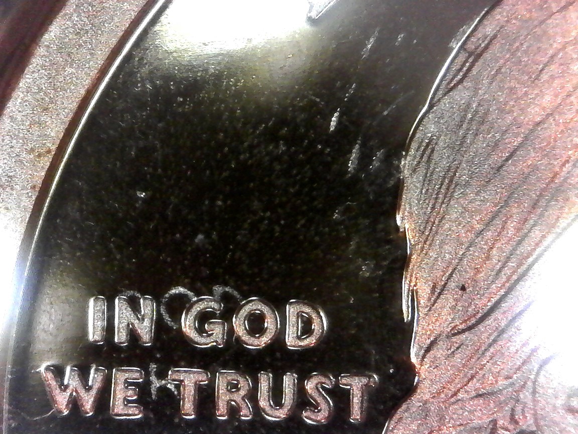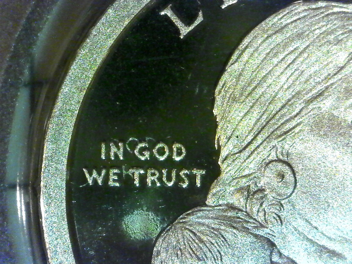 Hi Chris, Thanks for your input! I know, I know it looks like a reflection. But a reflection moves in different lighting - these letters are on the coin in the same place no matter how I light it (note the glare on the letters): Lit from bottom left Lit from top left