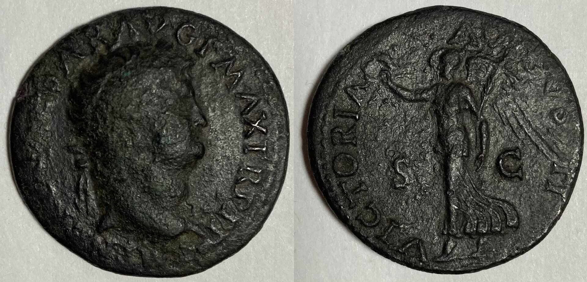 Here is a Nero Dupondius that made it easy on me - it has a "II" below Victoria on the reverse as well as being radiate. An interesting experiment in double-marking the denomination, but not one that was used very long: Nero Æ Dupondius (c. 64-67 A.D.) Lugdunum Mint NERO CLAVD CAESAR AVG GER P M TR P IMP P P, Radiate head right, globe at point of bust / VICTORIA AVGVSTI, Victory advancing left, holding wreath and palm branch; II in exergue. RIC I 379; WCN 495. (12.38 grams / 28 mm) eBay Feb. 2020 Attribution Note: Many varieties of this type: Obv.: Radiate (not laureate) bust right, CLAVD and GER (no M), two P's at end of legend. Globe at tip of bust. Rev.: Victory walking (not flying) left (see ground line below feet, above II) Here's an enhanced view of the II - I don't see this on your example; perhaps the II wasn't on all the dupondii? Nero AEs confuse me, there are so many varieties: