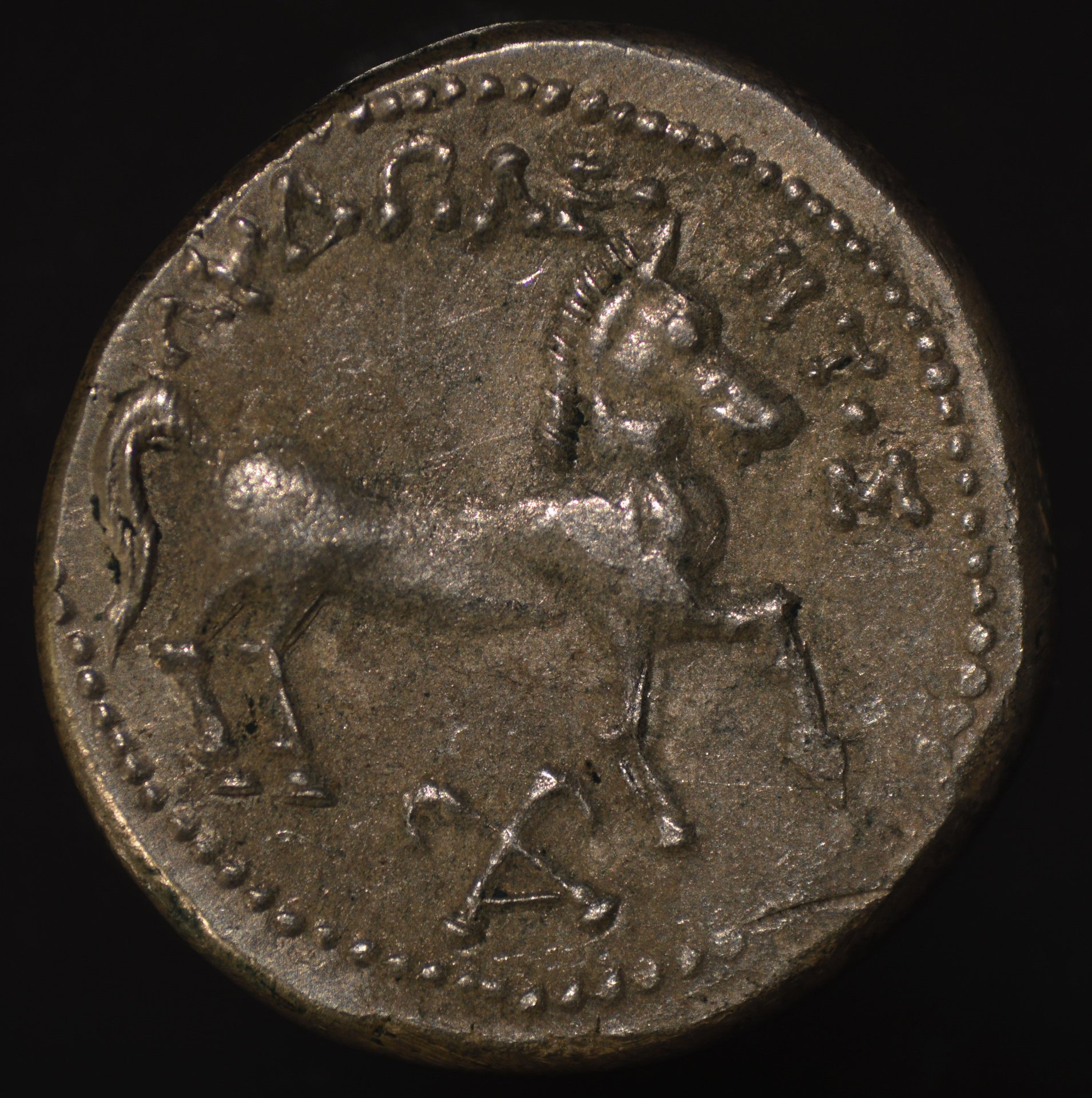 Aha, i see what you mean. However this is not a casting seam: the coin lies on a glass surface and it is the reflection on the glass. To be sure, I've just checked the coin again: there are no casting seams on the side. I've rotated the reverse side as well: it's aprox. 170 degrees rotated (horse would be up side down compared to the observe).