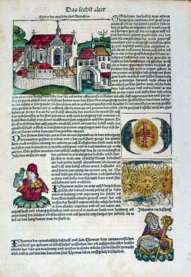 I have this framed because of the sundogs-- page CCIII from the German edition of Hartmann Schedel's Nuremberg Chronicle, printed by Anton Koberger in Nuremberg, Germany, in December of 1493.