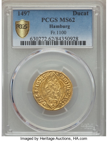Dating of European coins using a calendar system that is most similar to the one we use today started in 1234 AD in Roskilde, Denmark. The next coins were dated 1372 by Aachen, Germany and Schoonvorst-Sichem, Netherlands. The first collectible date would be from Aachen, 1374. First dated copper coin, 1481 from Brabant. First dated gold was 1436 from Cologne, Mainz, Palatinate and Trier. This series of coins were minted through 1438, some common and others very rare. A few were dated after this but regularly issued did not start until 1490 in Germany and 1487 for the rest of Europe. Panzerman's beautiful gold ducat from 1497 has two varieties. the Levinson catalogue number for his is 1-362a. Austria struck a dated gold 7 dukat, but it was struck after 1500. Alde's coin is dated (14)75. On the second image to the left of the star an upside down V and L are the date. Many ancient coins have regnal dates. The establishment of an empire,city,state or ruler. The Greek alphabet is used commonly. Byzantine coins especially copper/bronze coins do this as well but they use Roman numerals. Arabic coins minted from the mid 600's onward have dates but their numbers are difficult to read.