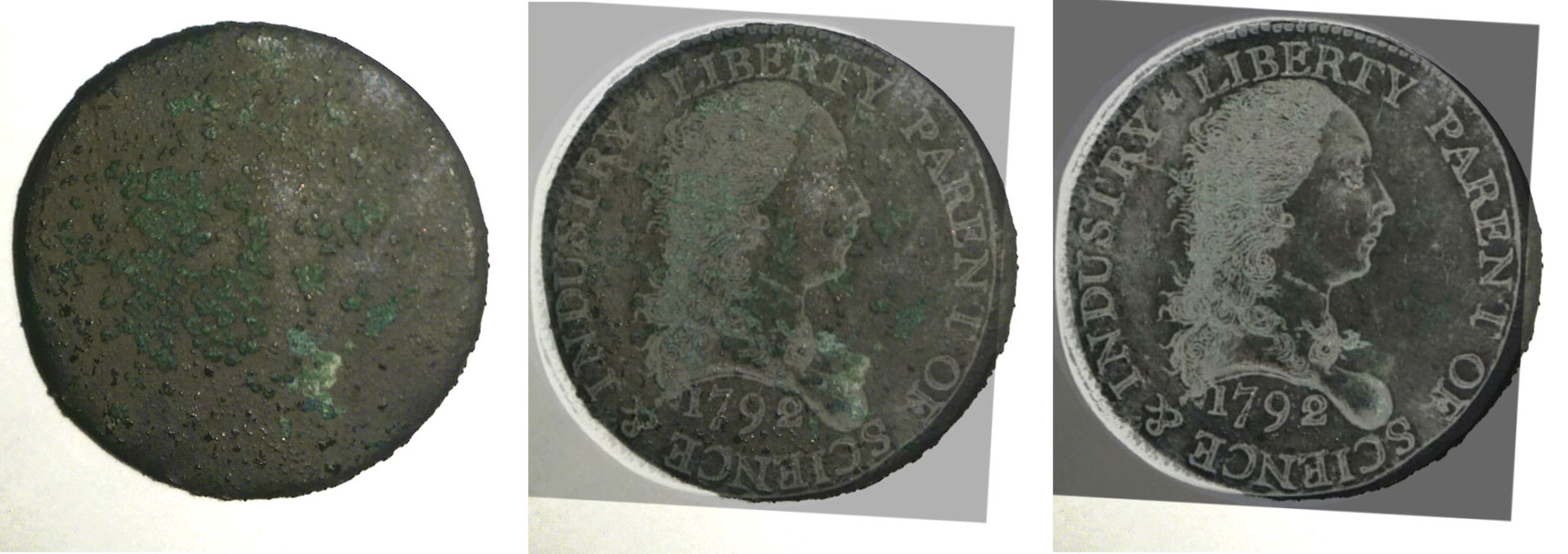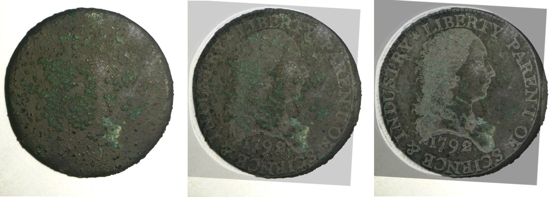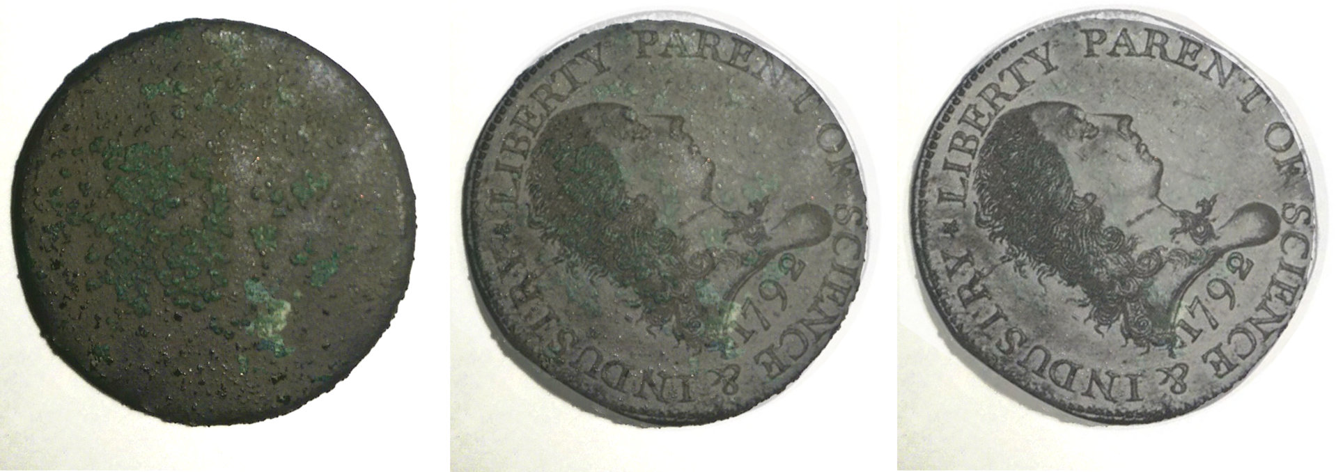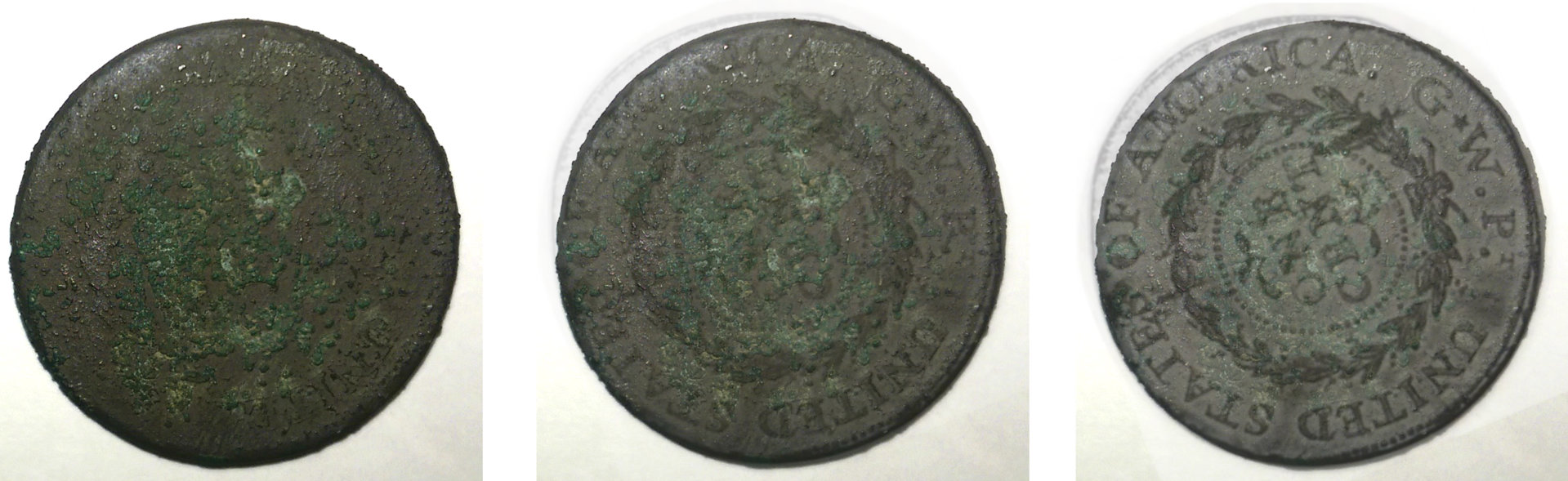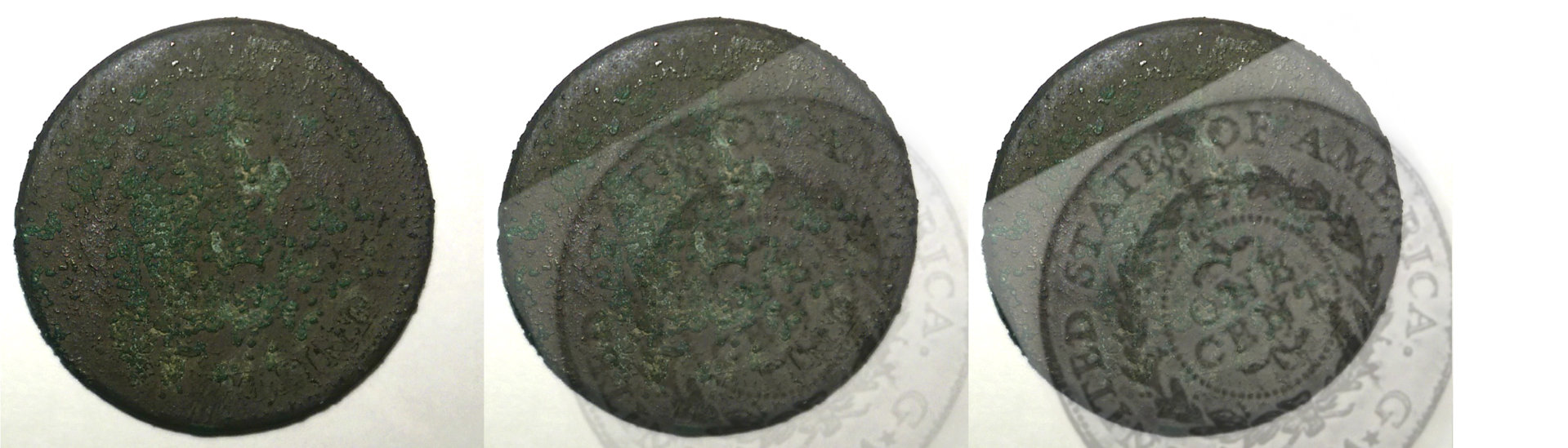 Fair -- the obverse is certainly rougher. Would corrosion eat away less dense features of the coin before more dense? I would think yes. Periods and the "berry" features of the wreath are going to be more dense by the nature of the die strike that creates them - hence why they are left behind -- it takes longer for verdigris to eat away at them. As for the reverse -- what you call lumps of corrosion is obviously a sprig pattern. And yes, the lumps of corrosion beneath it seem to match the shape of the C and T in CENT, as the most identifiable. I'm guessing I won't convince anyone who doesn't fade in and out the opacity slider on the PXDs. Has anyone done that?