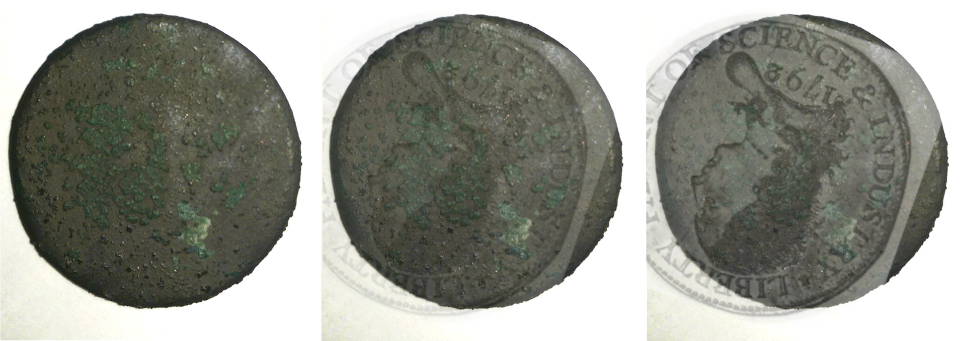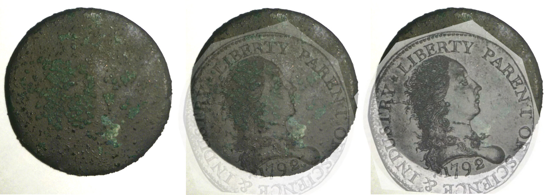 Thanks, Conder101. Here's my comparison of the reverse. The odd angle between the A3 and U that are visible is what I noticed first and made it hard to identify -- it really doesn't seem to match any specific model. Upon further investigation, it looks like it was (at minimum) double struck with rotation, producing that strange offset. Here's the one comparison I did on the reverse, at a first matching angle, overlay at 40% opacity. I'll post another with the rotated position overlayed: I'll also try to post the comparison of the obverse. I don't believe it is a matron or liberty because it appears to be a right-facing bust -- the verdigris appears to be hair, and the uncorroded spots align with where a right-facing nose would appear. I'll post additional pictures in a few minutes. Just need to save them in a more accessible format than PXD