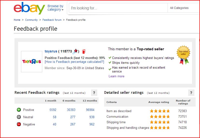 Notice the 962 Negatives in their Feedback. Here's the link to their negative feedback. http://feedback.ebay.com/ws/eBayISAPI.dll?ViewFeedback2&userid=toysrus&iid=-1&de=off&items=25&which=negative&interval=365&_trkparms=negative_365 So how has eBay cleaned up Toys R Us' feedback?