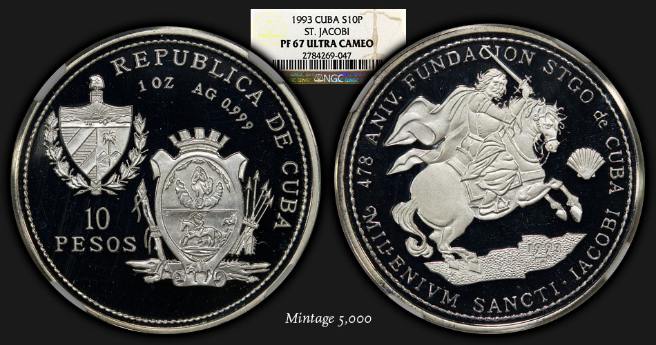 Nice design! I just wonder what this "Millenium Sancti Iacobi" refers to ... St. James is said to have died (well, been killed) around the year 50. The city of Santiago de Cuba was founded in 1515, as the coin says too. Santiago de Compostela (in Galicia, Spain) is quite a bit older than 1,000 years, so -- I'm stumped. 1993 was a "holy year" there (Ano Santo Xacobeo) but why a millenium? Hmm. Christian