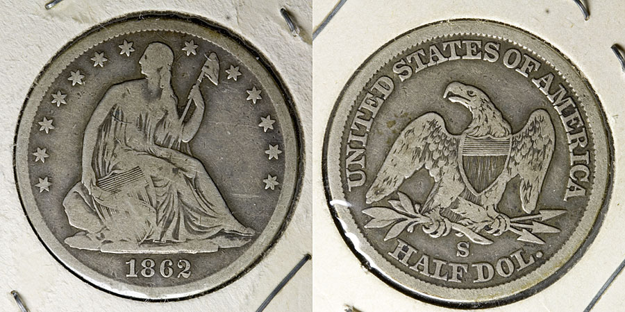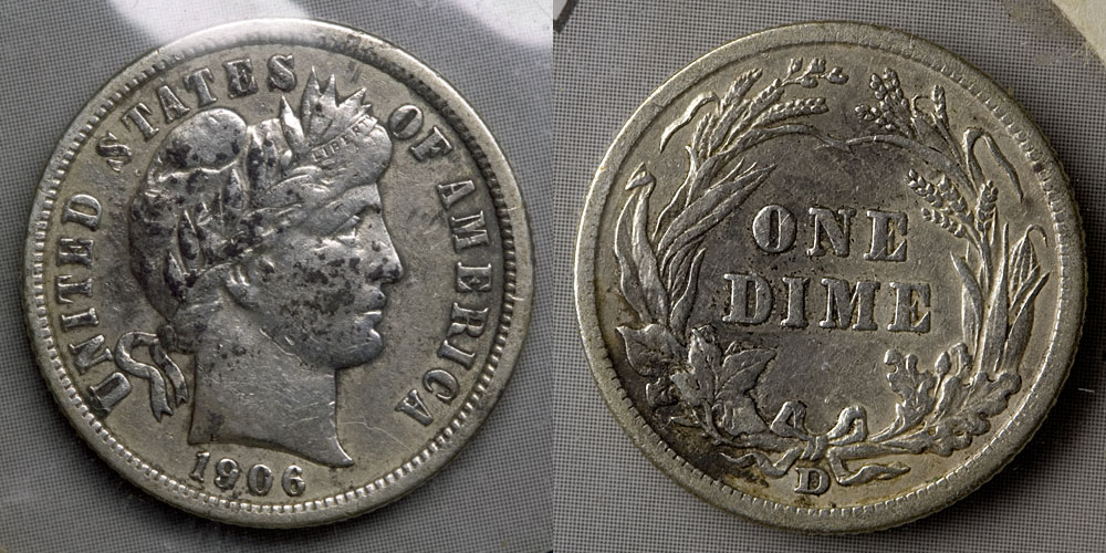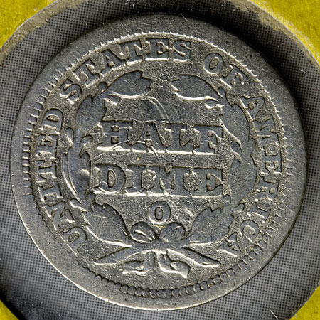 Detailed images Just for the sake of completeness, here's what that half-dime, Barber dime, and the seated halves look like up close. I don't know what someone did to this half-dime -- it looks like they started to try to drill through its center, but couldn't quite figure out how: Now that I've examined it more closely, this dime looks like high VF details to me, but it's had a hard life and probably a cleaning or two, and it hasn't aged well -- worse skin than I had as a teenager! This half is G at best, and the obverse scratch drops it further, but I still think it's not ready for the melting pot: This half just misses VG, I think -- the apparent hit under the breast is actually a cut in the Mylar, and I don't see corresponding damage on the coin itself: I won't be tedious enough to post photos of the other coins; none of them were particularly surprising. I'm actually somewhat pleased with the Barber dime; even though it's got problems, it's nicer than any other Barber coin I've had so far. I'm quite pleased with the halves, although I may try to resell them and put the money toward a type example in better condition. Overall, I don't regret my bid, although I'm sure the seller doesn't regret it either.