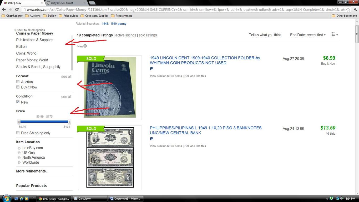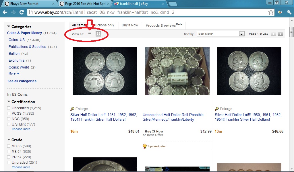 Here is a screenshot of the new format. Under condition in the coins and paper money section, NEW, USED. Really? Nowhere that I can find, can you search for specific grades, companies, composition, mints. I'm sure this format is helpful for other types of items. Especially new items since ebay is trying to compete with amazon, but for coins it is horrible. JMO