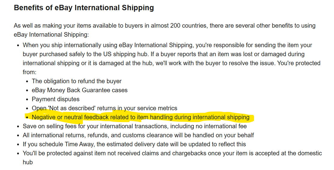You might have to call back and see if you can get another representative. The rules suggest that you should be protected from negative feedback. https://www.ebay.com/help/selling/s...s/ebay-international-shipping-program?id=5348