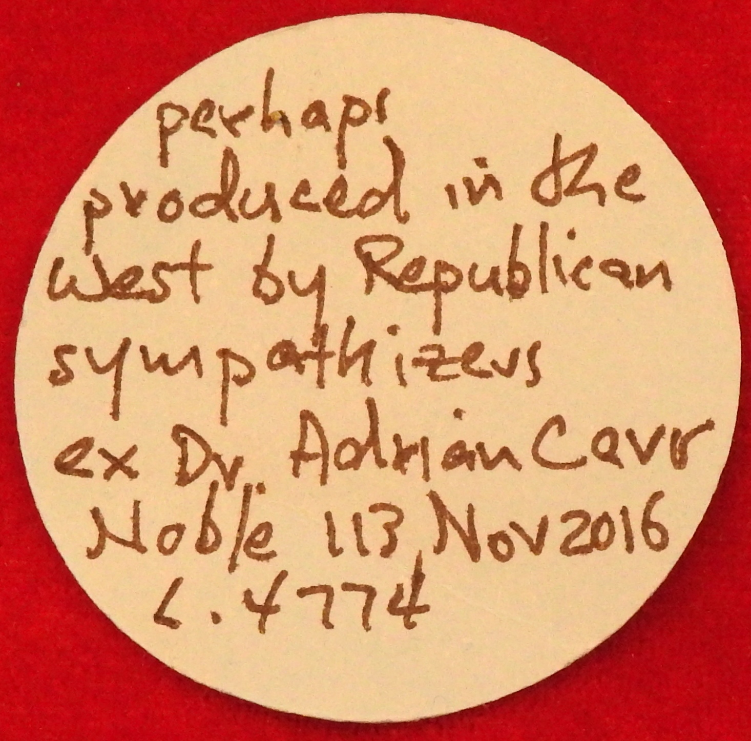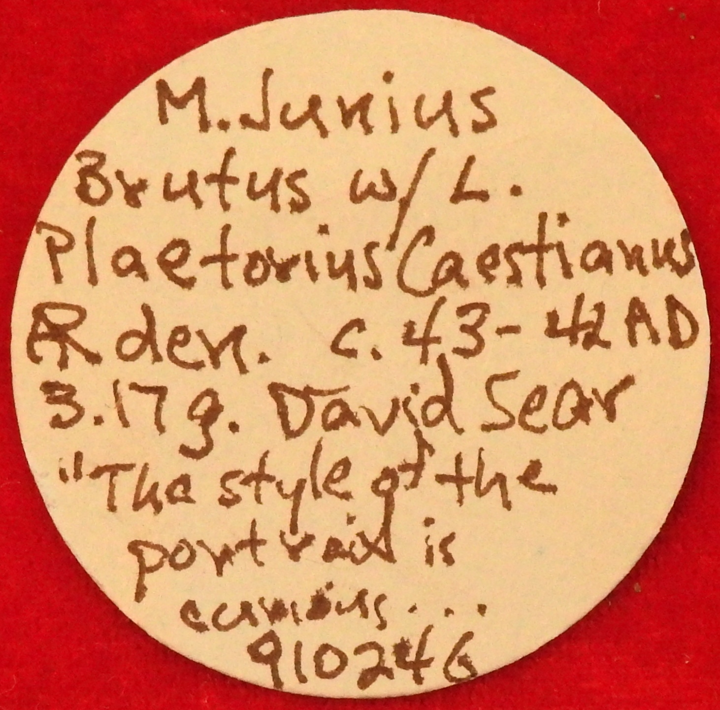 I picked up an EID MAR coin today. It is rather beat up and and the auction house that sold it last November 2016 said it is probably an ancient forgery. Noble Numismatics pics from auction last year. The description that went with the coin is below. "M. JUNIUS BRUTUS WITH L. Plaetorius Caestianus, silver denarius, probably an ancient forgery, original struck in Northern Greece c.43-42 B.C., (3.17 g), obv. [BRV]T IMP to right, downwards on left L.PLAET.CEST, bare head of Brutus to right, rev. EID MAR, Pileus between two daggers, Cr.508/3 S.1439, Babelon Junia 52 and Plaetoria 13, Syd 1301, cf.Sear Imperators 216, Cahn, EIDibus MARtiis, Q.Tic. 18, 1989, (dies not listed), Flan cuts and some gouges, weakly struck on top of the head, through attempting piercing, edge filed in places, otherwise nearly fine and very rare." " Ex Dr. Adrian Carr Collection and purchased in 2001. Various communications by Dr. Carr are indicated and expanded below. It is thought to be a contemporary forgery ie., at the time of Brutus. The coin was definitely a struck coin and not cast and has the weight and silver composition of other military pieces of the time of Brutus. Mapping shows the same alignment of the coin's obverse as a specimen recorded in Foss' book with the prominent epiglottis and thinner neck. This specimen is not from any dies noted by Cahn. The reverse has an interesting map in as much as the dagger on the right is slightly higher than that on the left which is unlike almost all illustrated by Cahn. It needs to be remembered that other military issue coins of the time show the work of some apprentice engravers with mistakes and variations in the dies. The coin was sold to Dr. Carr by its original owner as genuine. Communication between the original seller and the agent for the coin states; 'the coin from which you bought from my consignor came from a very large collection from Alberta Canada in 1947 and had included many fabulous Roman and Greek rarities including a Carthage Decadrachm for which I bought the coin for $22,000 several years ago. Several Roman coins of Pertinax and P. Niger were in there as well, I own both of them. With the Eid Mar coin, unless I can positively 100% identify it as genuine I cannot sell as genuine.' David Sear said the following: 'The style of the portrait is certainly curious and seems to differ markedly from that of other published specimens. The piece definitely looks ancient, but I wonder whether it might be some type of 'contemporary forgery' struck unofficially in Imperatorial times in imitation of the regular issue. The rather caricaturish-nature of the features look to be somewhat more reminiscent of some of the early triumviral portraits of Antony and Octavian, so perhaps the coin may have been produced in the West by Republican sympathizers.' The 'Eid Mar' denarius, one of the most famous rarities of all ancient coins, was struck in the summer of 42 BC at a mint moving with Brutus's army in Greece. The date (Eid[ibus] Mar[tiis]) takes on the character of a symbolic watchword, while the pileus represents liberty regained and the daggers are the messengers of the deed." My pics need some work, but here they are: The description tag that came with the coin. I saw the coin at auction last year, but could not push the bid button. When I saw it in person, I decided that an EDI-MAR place holder coin is a pretty good thing!