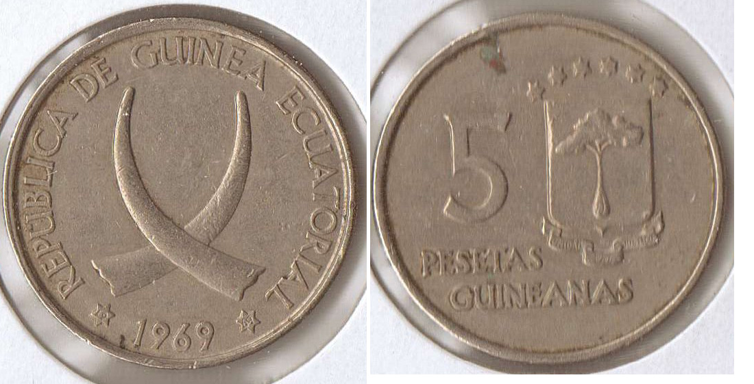 This 1969 5 pesetas from Equatorial Guinea has tusks, which are from elephants. I also have seen a Thailand silver coin with elephants, but I don't own it. What else do you all have?