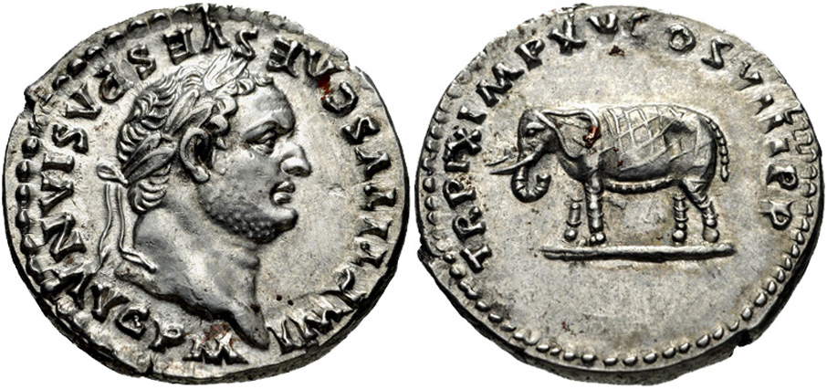 TITUS AR Denarius OBV: IMP TITVS CAES VESPASIAN AVG P M, laureate head right REV: TRP IX IMP XV COS VIII PP, elephant walking left Struck at Rome, 80 AD RIC 115