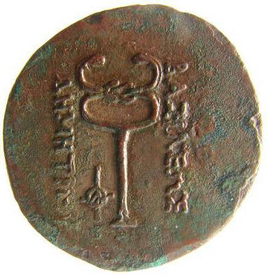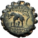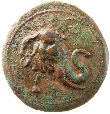 Demetrius I Trichalkon with ELEPHANT 200-185 BC Diameter: 29.5 mm Weight: 12.61 grams Bactrian Kings, Demetrius I, bronze Attic trichalkon of: Obverse: Head of elephant with bell hanging from neck Reverse: Caduceus. Reference: Bopearachchi-16, Mitchiner-1086, SNG ANS 209 Other: LOVELY brown and green patina, great example