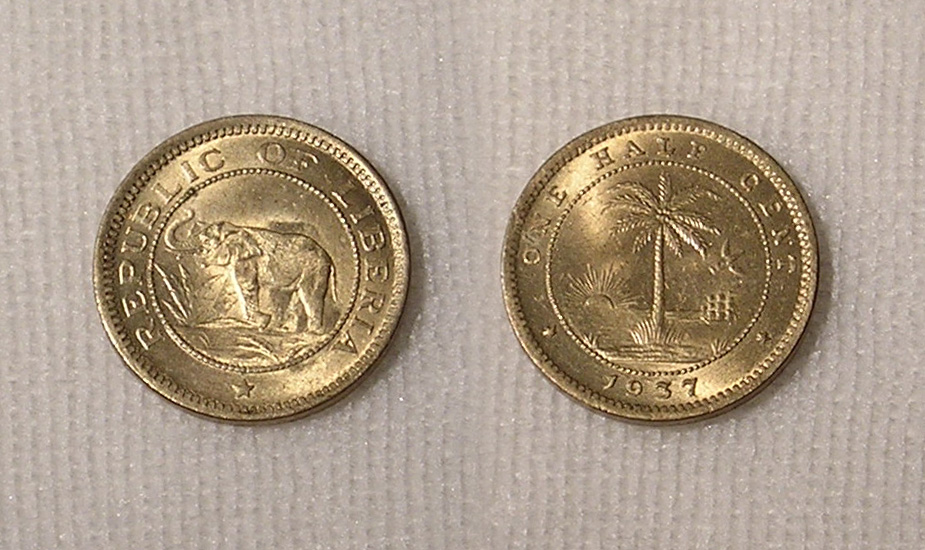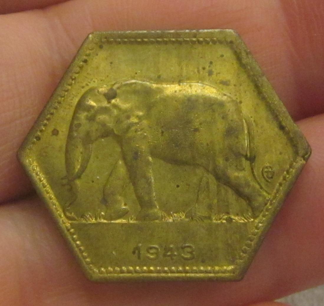 Liberia 1937 1/2 cent Belgian Congo 1947 2 Francs (round) Belgian Congo 1943 2 Francs (6-sided) A trio of Belgian Congo Elephants (1 Franc, 2 Francs, & 5 Francs)