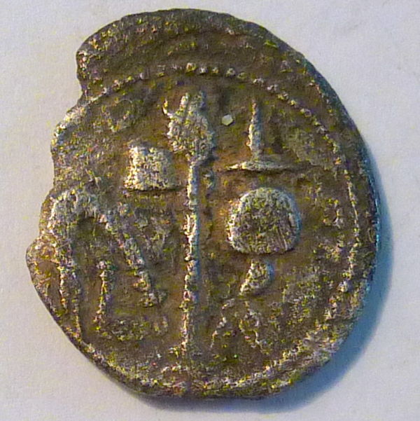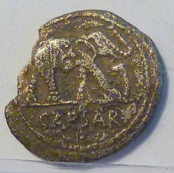 JULIUS CAESAR AR Denarius OBV: Elephant advancing right. CAESAR REV: Simpulum, sprinkler, axe and apex. No legend Struck at a military mint traveling with Caesar, 49 BC CRI 9, Sydenham 1006, RRC 443/1, S 1399 This is the first coin struck in the name of Julius Caesar. The symbolism on the obverse apparently alludes to the conquest of good over evil, Caesar's victory over the Gauls, while the reverse refers to Caesar's possession of the office of Pontifex Maximus.