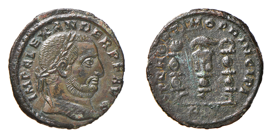 I don't understand how this coin could possibly be a coin of Licinius or Constantinus ? The inscription on the obverse is clear enough to read: IMP ALEXANDER PF AVG. It wasn't re-carved from a different inscription . The heavy tooling on the portrait is obvious, but lets not get carried away....