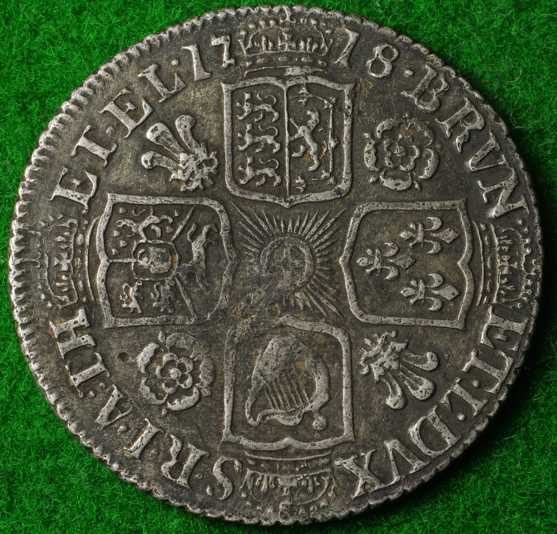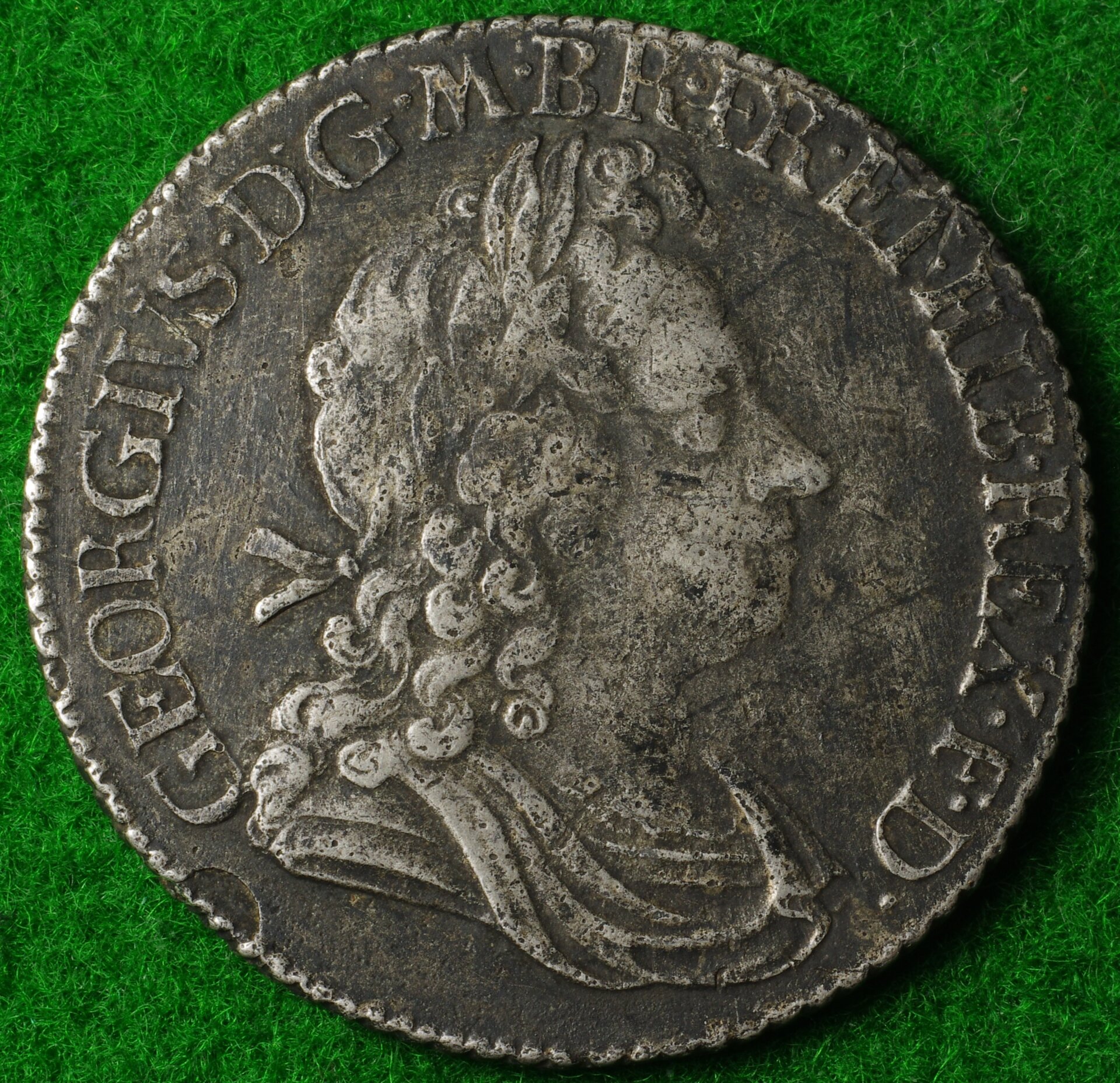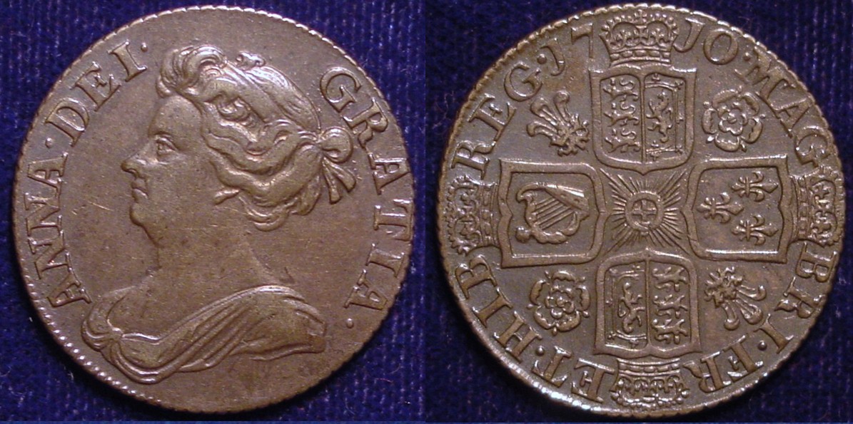 The George I is inscribed, in part: "DG", short for "Deo Gratia". How ironic, that this German guy shows up, an' they make him King of England; they have to, and they also have to mark on their coins how grateful they all are for his non-British Sauerkraut Majesty. He didn't even speak any English, and when the crowd of onlookers audibly grumbled and muttered as the royal household arrived, one of the German noblewomen reassured them, crying out: "Fee (sic) are here for all of your goods!"; to which some wit in the crowd called back, " Yes, and our chattels, too!".