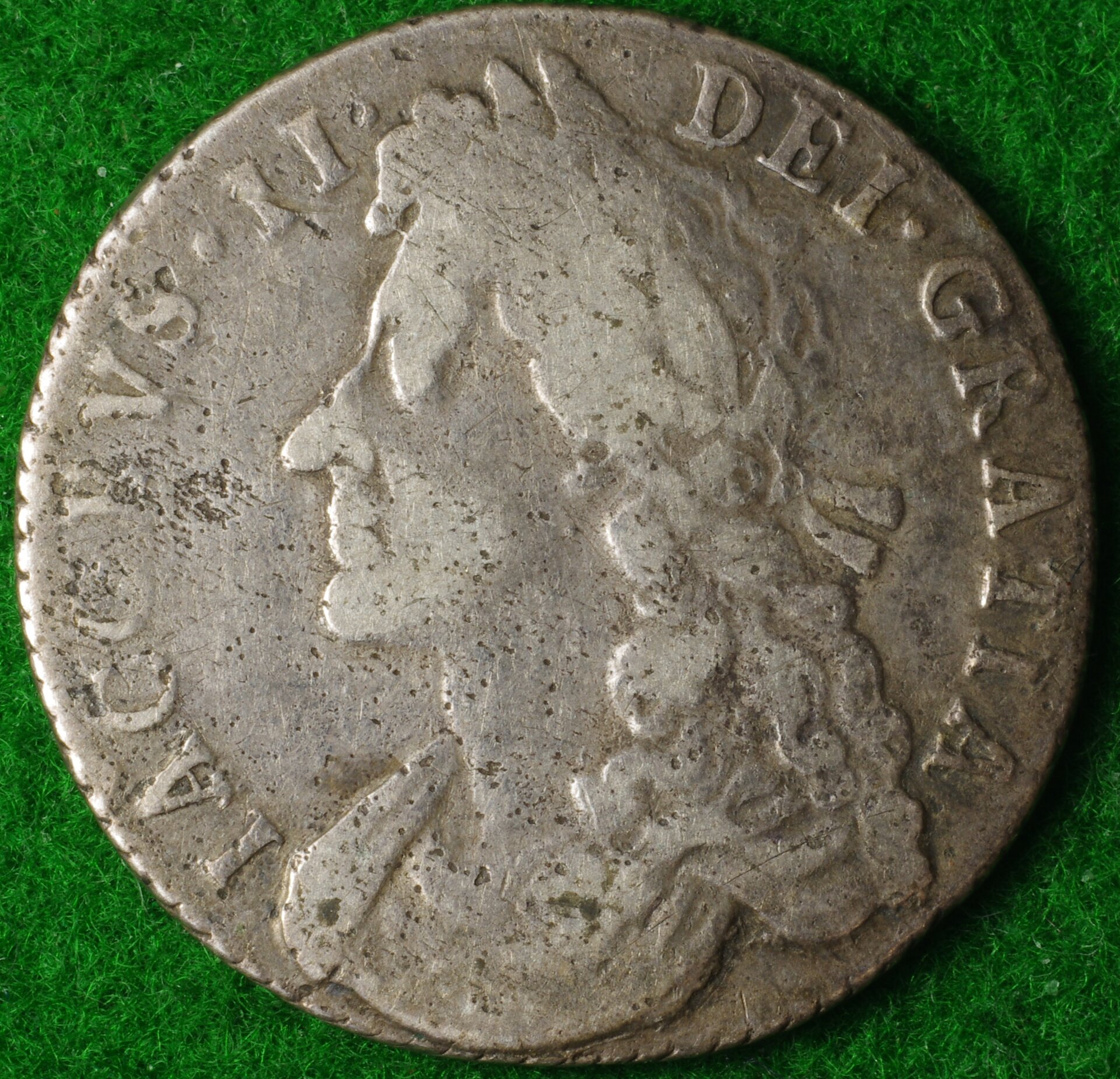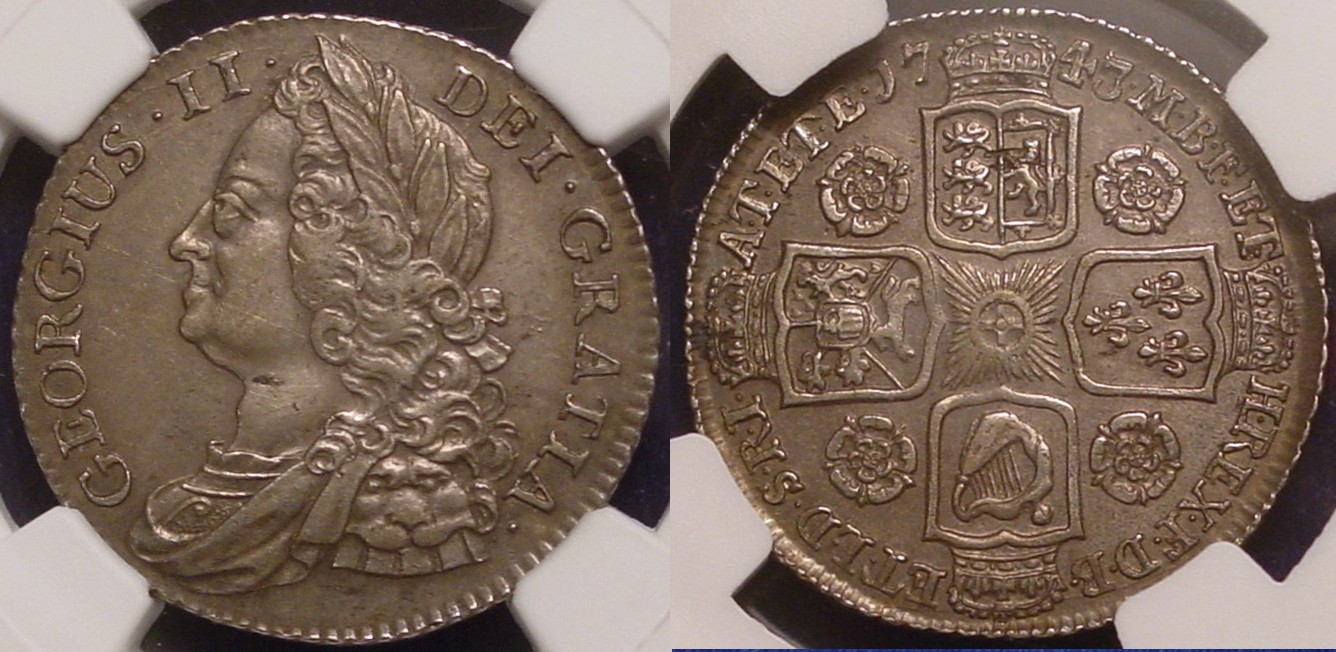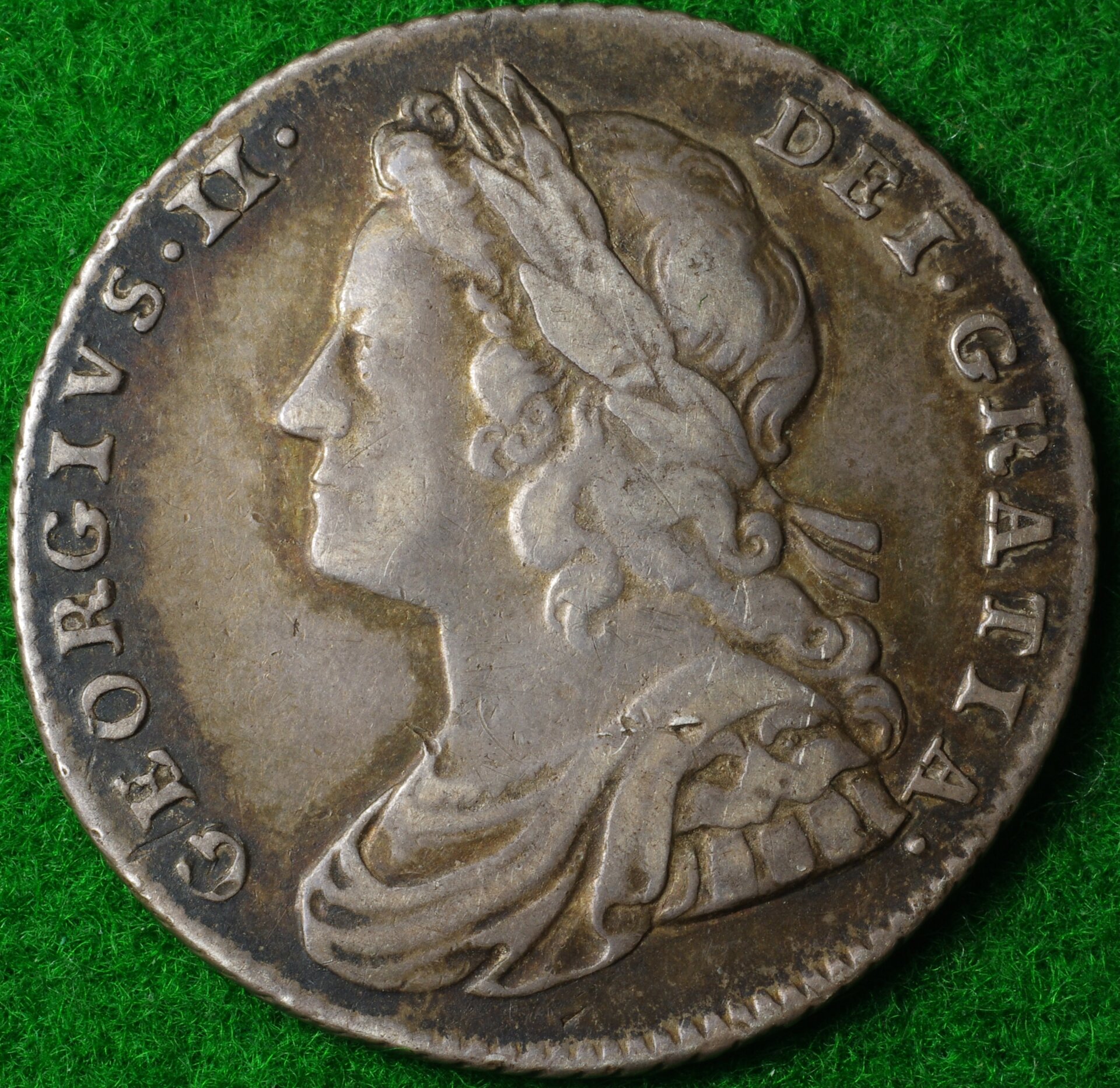 The George I is inscribed, in part: "DG", short for "Deo Gratia". How ironic, that this German guy shows up, an' they make him King of England; they have to, and they also have to mark on their coins how grateful they all are for his non-British Sauerkraut Majesty. He didn't even speak any English, and when the crowd of onlookers audibly grumbled and muttered as the royal household arrived, one of the German noblewomen reassured them, crying out: "Fee (sic) are here for all of your goods!"; to which some wit in the crowd called back, " Yes, and our chattels, too!".