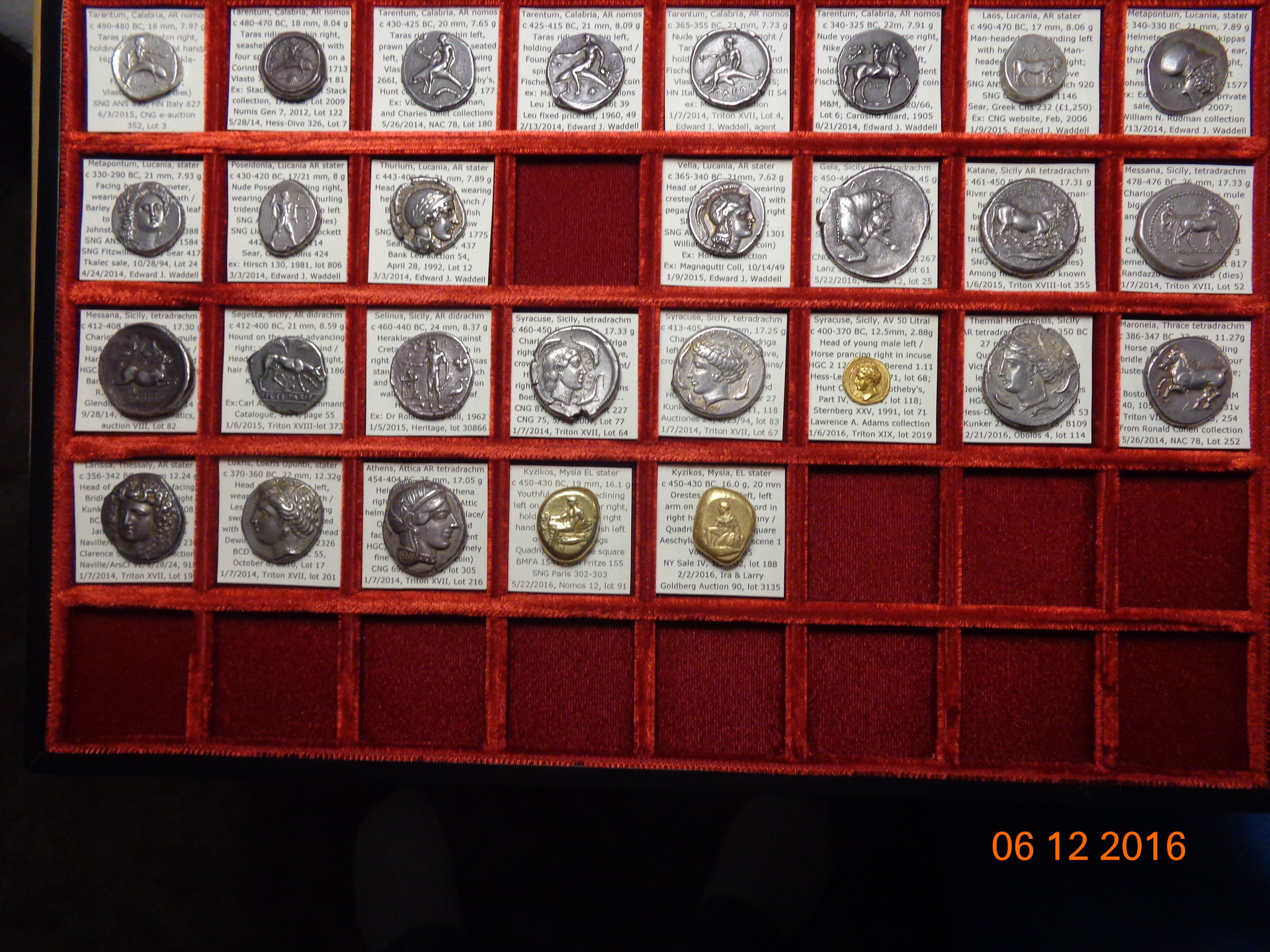 I imagine I'm one of the few forum members who can do this, but at the request of Eric Kondratieff and with help from TIF, I will post my entire collection in one Abafil tray photo. If I had a better camera, better lighting, and a tripod, it would be a much better photo. I can hear the groans already! The collection will total 29 coins when the empty compartment is filled. It is waiting for the Thurium double nomos from Goldberg, with which I recently started a thread.