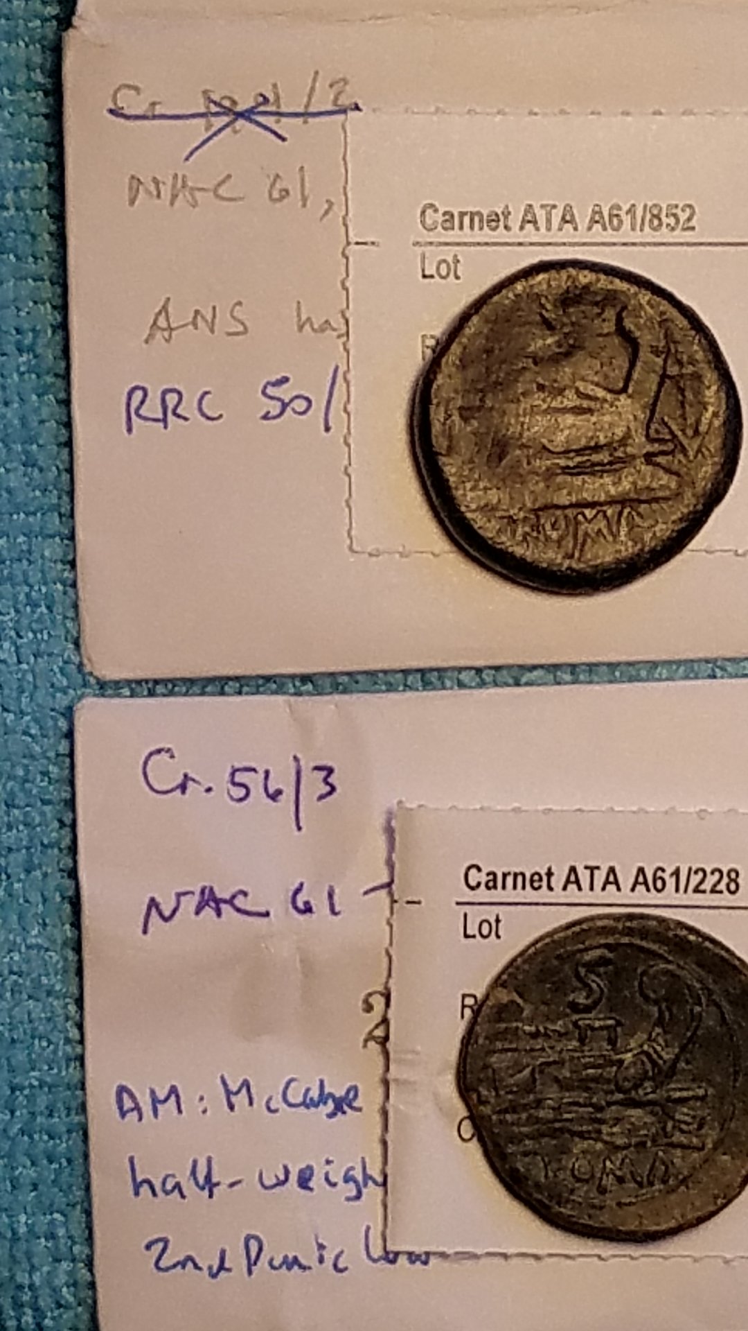 I'll take a stab at this. The envelopes with 21 & 147 are no doubt from whatever sale Rick originally purchased these coins from. Almost certainly that's pre-CoinArchives, so even with access to a world-class catalogue library it would be a tedious job to figure out which sale, from which firm, that was. I'm reasonably sure that the notes are in Rick's handwriting; I've seen a lot of it, but not for several years. (I didn't know there'd be a quiz!) I have none on hand to compare. Perhaps Carthago could check his catalogues purchased from Rick's library and confirm that that is Rick's handwriting. #228 in NAC 61 is indeed not the OP coin, but it IS part of the Crawford 56 series. I doubt that's a coincidence. I'm guessing the coin was scheduled for RBW I but pulled from the sale late in the process for whatever reason and replaced by the coin that did run in the sale. If that's correct, it follows that NAC just didn't bother to reprint the tag. That would be unsurprising. They do maintain an inventory in London; no reason why it couldn't contain RBW coins. Lastly, I note that the OP 56/3 was obtained from a recent CNG E Sale. Why not ask them what light they can shed on this?